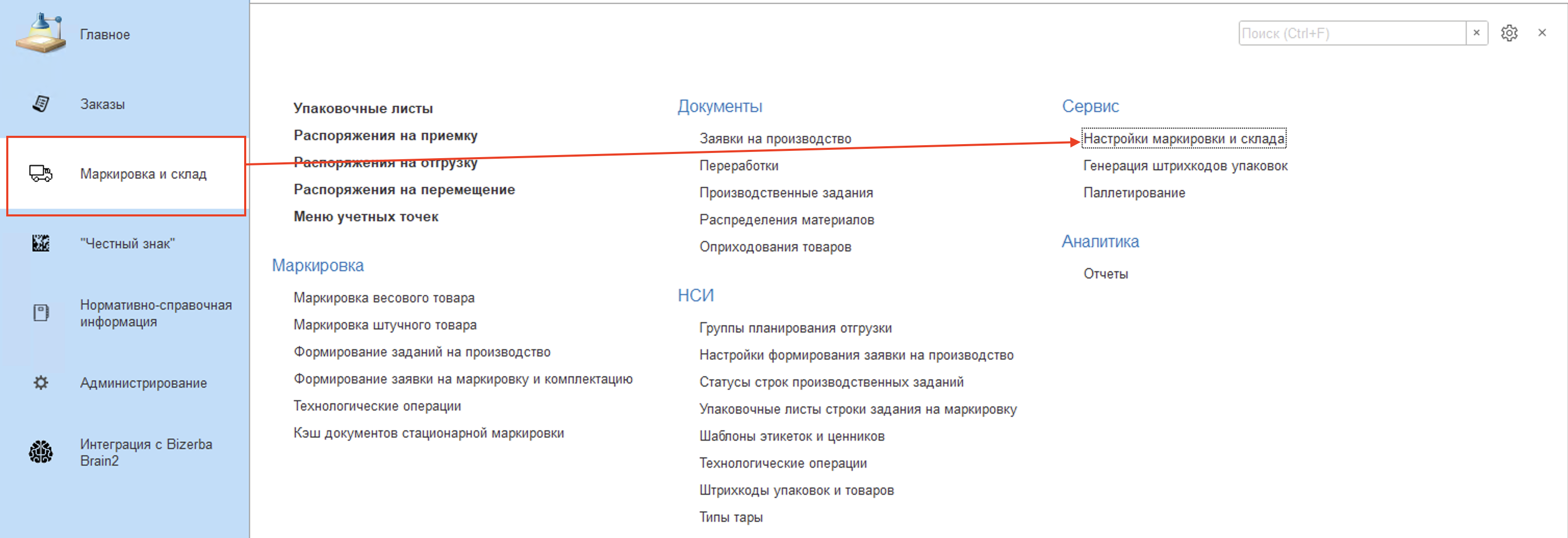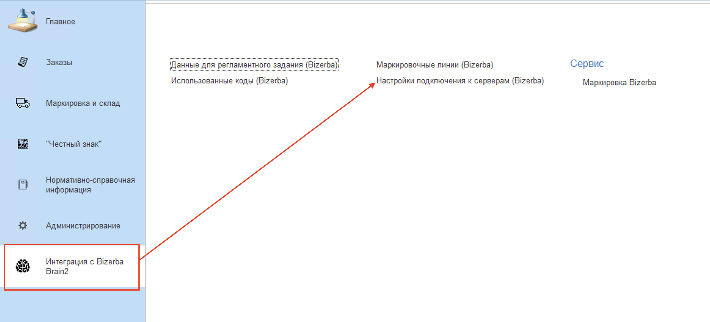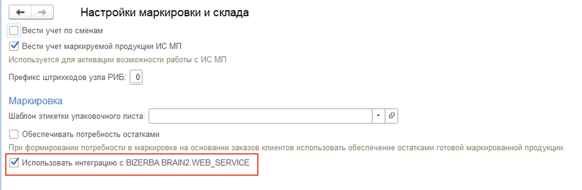 Для подключения подсистемы интеграции с оборудование Bizerba необходимо перейти в "Настройки маркировки и склада" расположенной подсистеме "Маркировка и Склад" - "Сервис", а затем активировать функциональную опцию "Использовать интеграцию с Bizerba".
