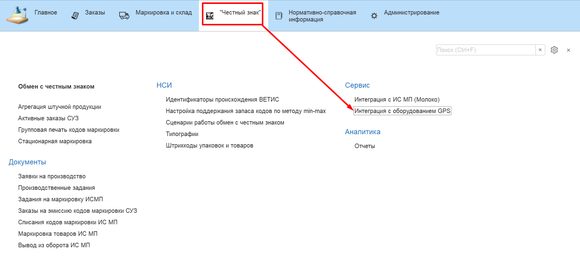 Все необходимые настройки для работы с оборудованием заполняются в обработке "Интеграция с оборудование" расположенной подсистеме "Честный знак" - "Сервис".