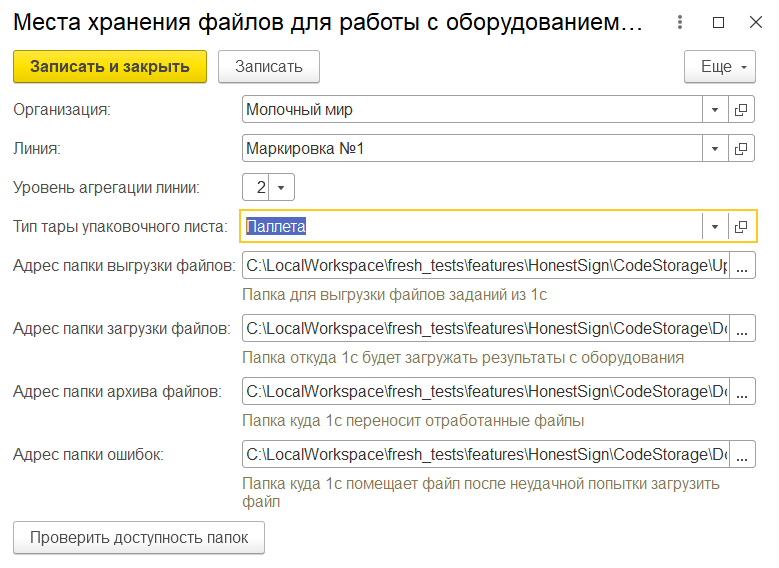 Места хранения файлов заполняются в разрезе Организаций и Линий (рабочих центров). Папки с файлами должны быть доступны с сервера. Для каждого РЦ указывается: