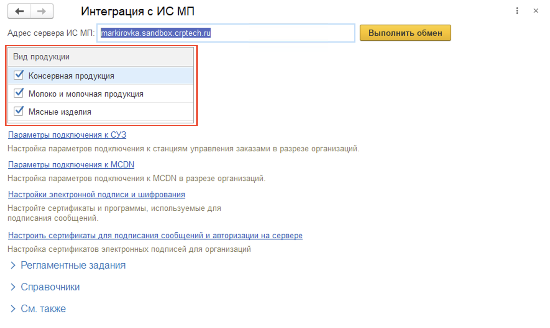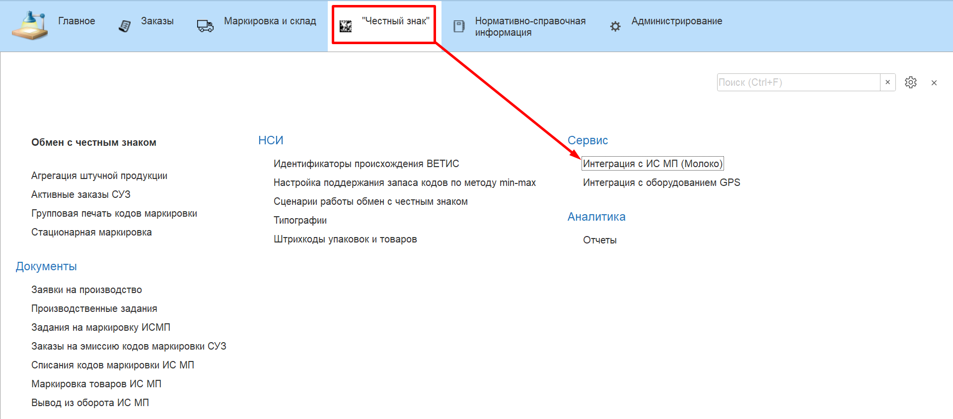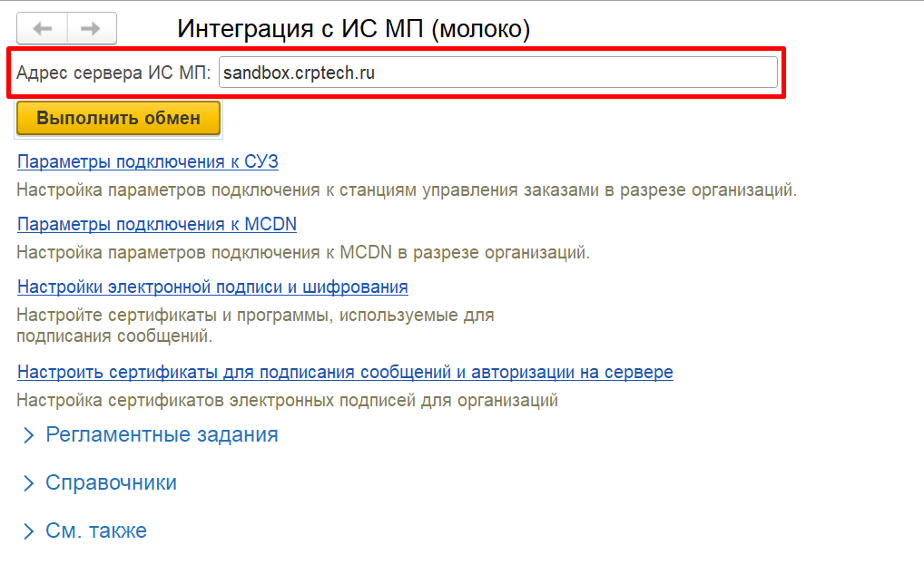 В начале работы с подсистемой "Честный знак" необходимо произвести настройки обмена с ИС МП (информационная система маркировки продукции). Для этого заполним настройки в обработке "Интеграция с ИС МП (молоко)" расположенной подсистеме "Честный знак" - "Сервис".