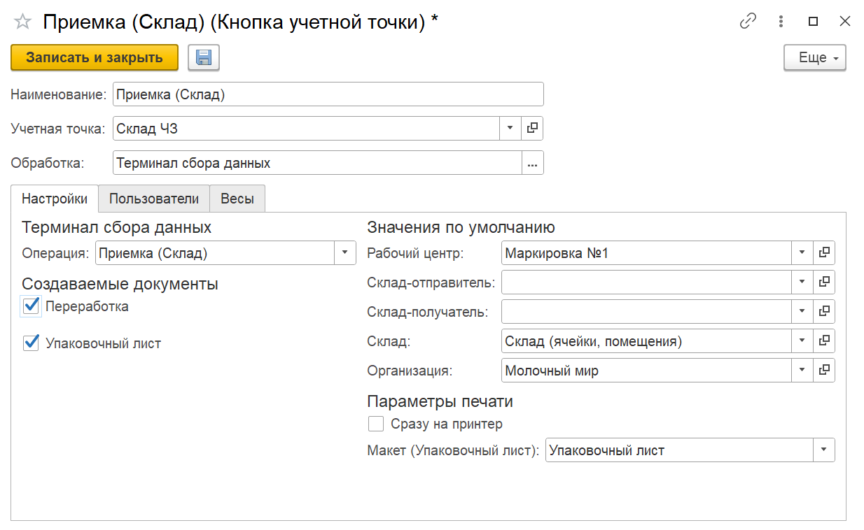 При создании кнопки учетной точки "Приемка" указываются: