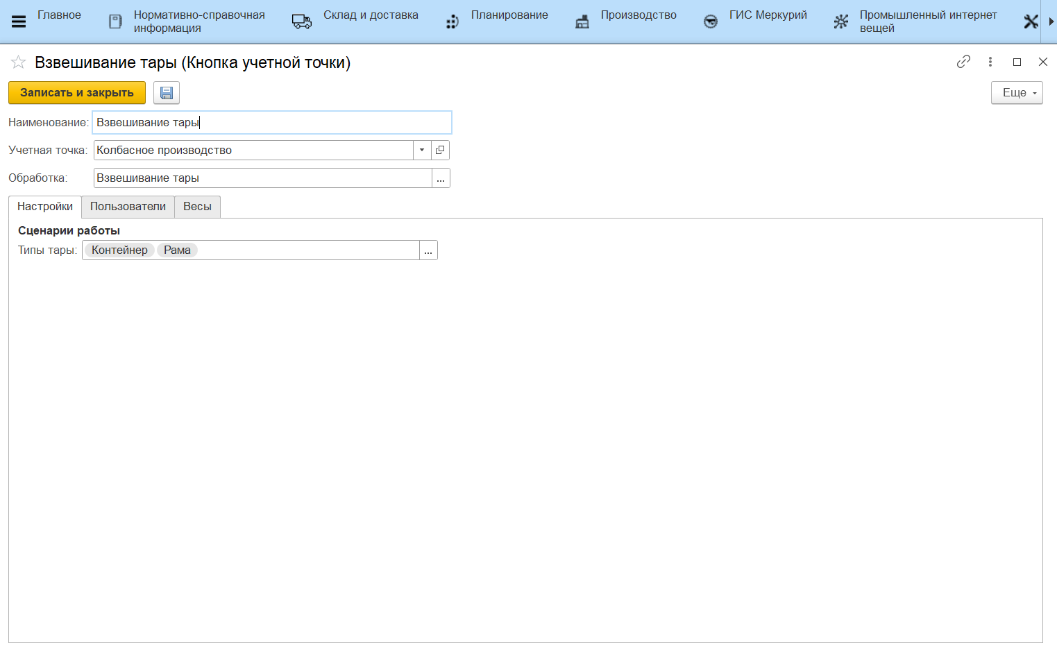 - Тип тары - с тарами данных типов можно будет проводить операцию перевзвешивания.