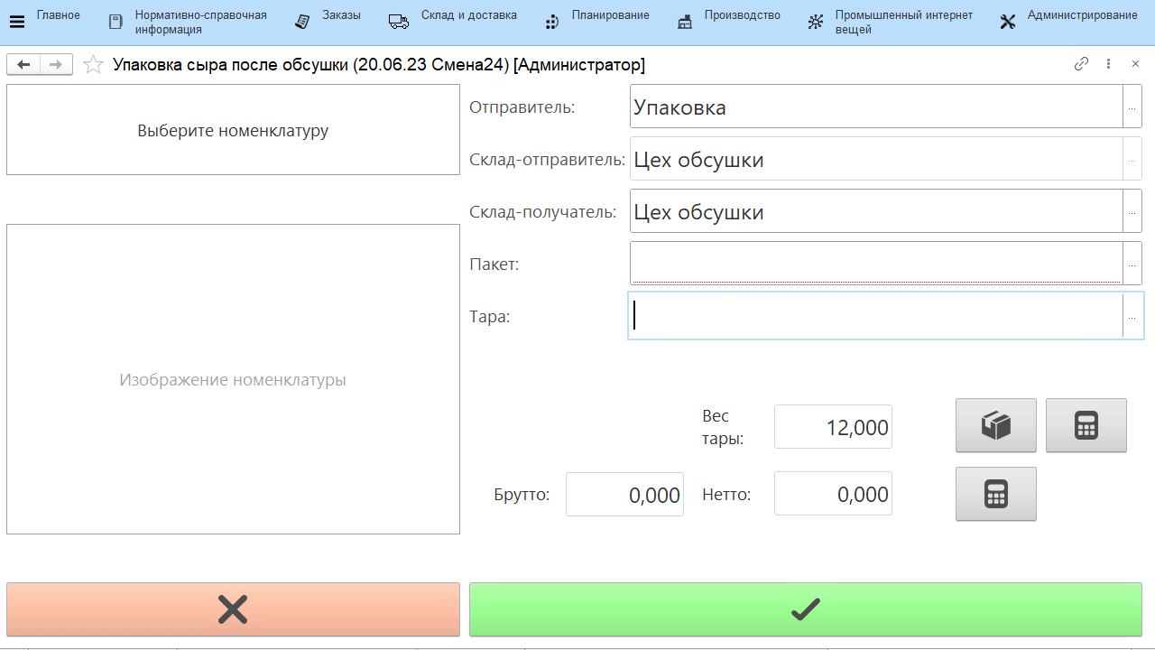 В разрезе тары (справочно) - указание конкретной тары выпуска на киоске становится не обязательным, но обязательно зафиксировать вес тары с весов. Если дополнительно включено "Использовать калькулятор тары", то указание состава тары также становится необязательным. Если выпуск все-таки был выполнен на конкретной таре, но на складе (отправителе и/или получателе) не ведется учет по таре, то контроль остатков и местонахождения в разрезе тары не будут выполнятьсяТипы тары Отображается, когда стоит учет в разрезе тары. Ограничивает список выбора тар в АРМе - будут доступны только с указанными типами Указывать вес тары Завешивание идет на таре. чтобы получить точный вес продукции нужно из общего веса вычитать вес тары Выпускать на таре материала Если включен, то выпуск всегда будет идти на таре материала без возможности изменить это Использовать калькулятор тары Можно указать вес тары в виде составных частей с заданным в системе фиксированным весом (см.ниже "Пример 2") Типы тары для калькулятора Отображается, когда включено использование калькулятора тары. Ограничивает список типов тар в калькуляторе Создавать одну партию на смену Включает/отключает создание только одной выпускаемой партии для любой продукции в указанную смену.
