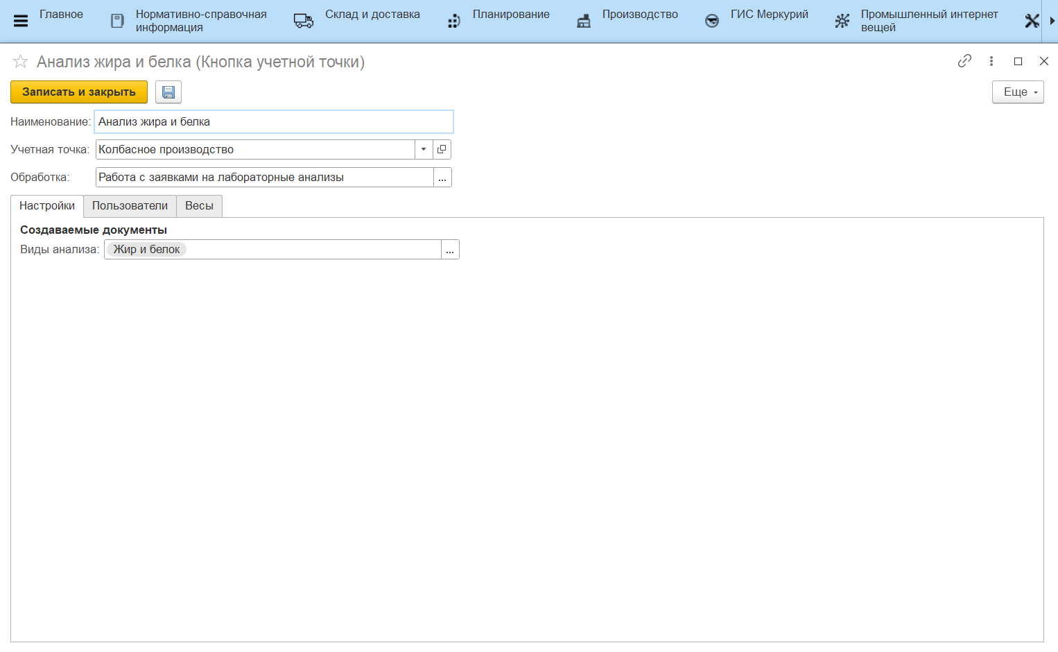 - Виды анализа - список видов анализа номенклатуры, заявки по которым будут отображаться в АРМе.