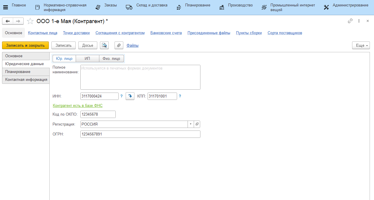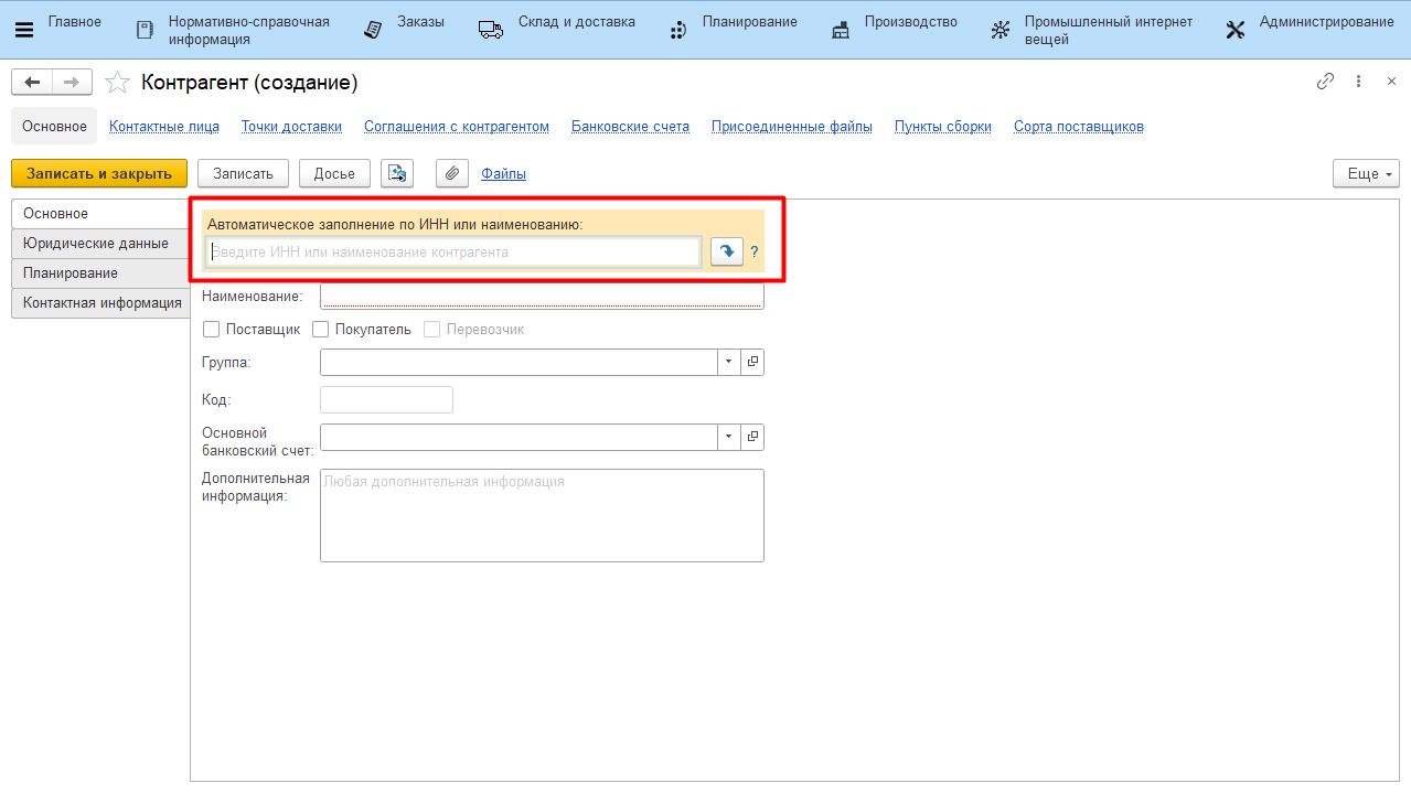 Элементы справочника могут быть заполнены вручную или загружены по ИНН или наименованию (если подключена интернет поддержка и установлен признак "Автоматически проверять контрагентов по ЕГРН").