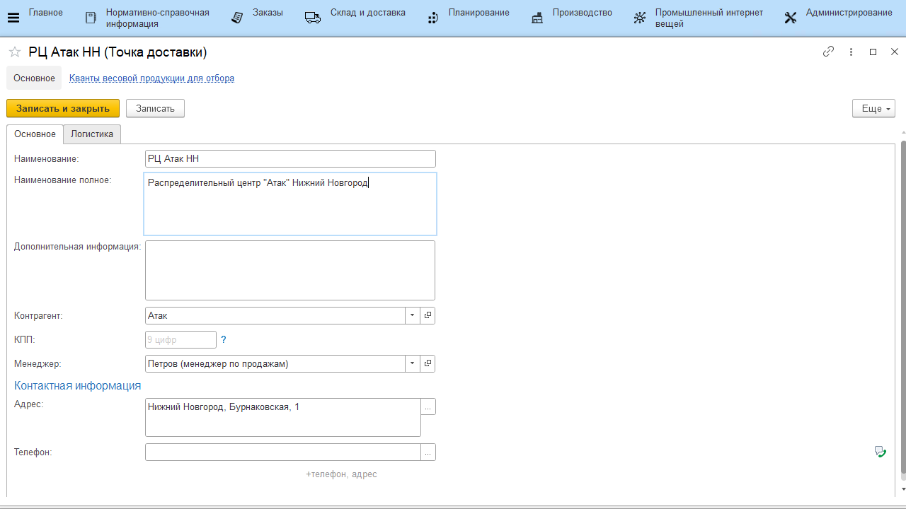 В справочнике "Точки доставки" указываются торговые точки клиента, до которых будет осуществляться доставка.