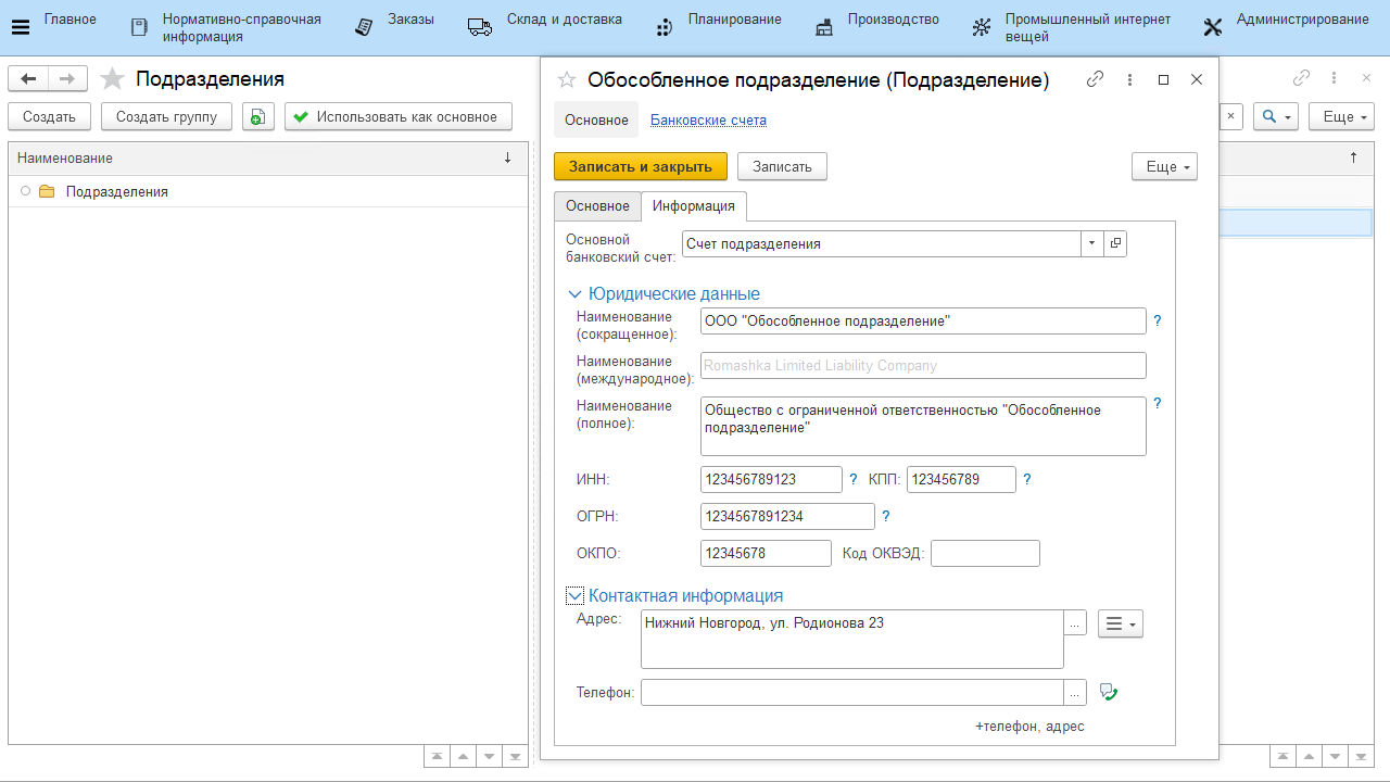 Если у подразделения установлен признак обособленности, то в карточке подразделения отображается вкладка "Информация" и доступны к заполнению реквизиты, которые указываются в печатных формах для грузоотправителя.