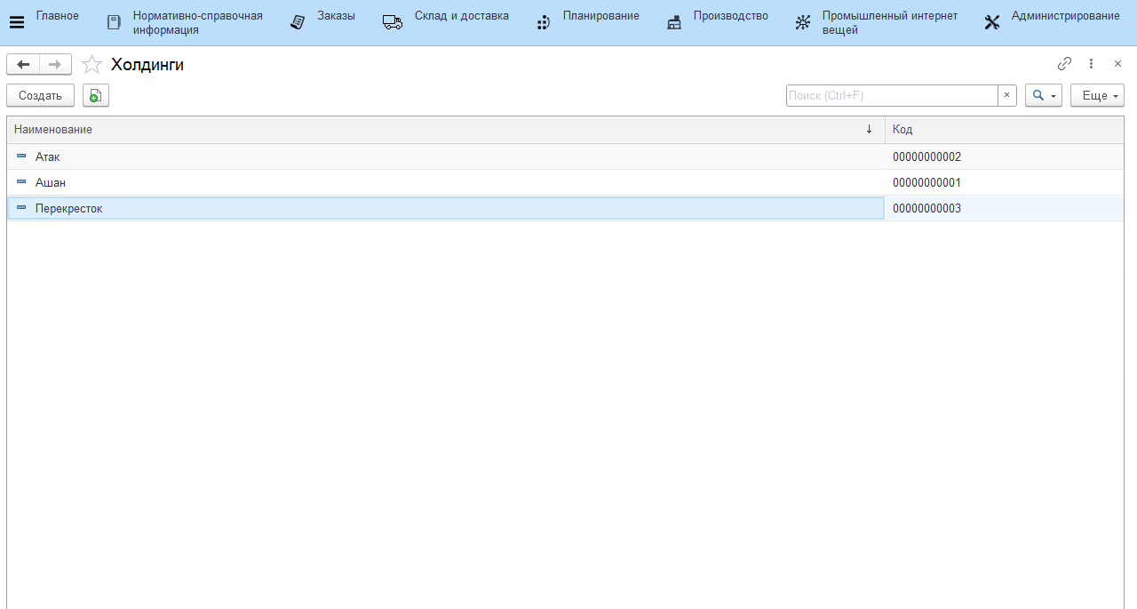 Справочник "Холдинги" содержит информацию о крупных компаниях, которые имеют несколько дочерних компаний, и предназначен для хранения иерархии партнеров. Подробная информация о дочерних компаниях холдинга указывается в справочнике "Контрагенты".