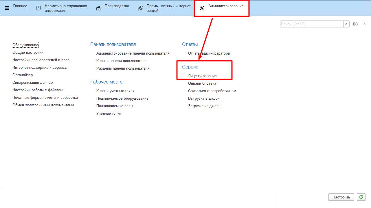 Для получения лицензии необходимо перейти в раздел "Администрирование" и выбрать "Лицензирование":