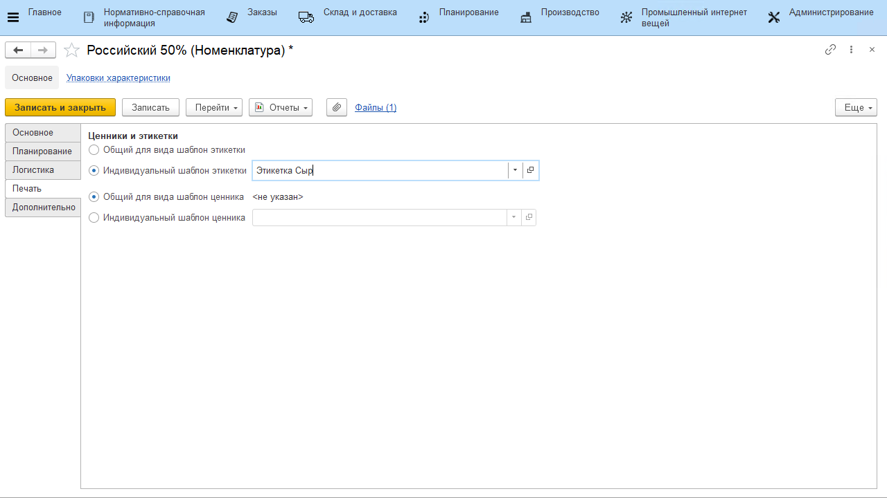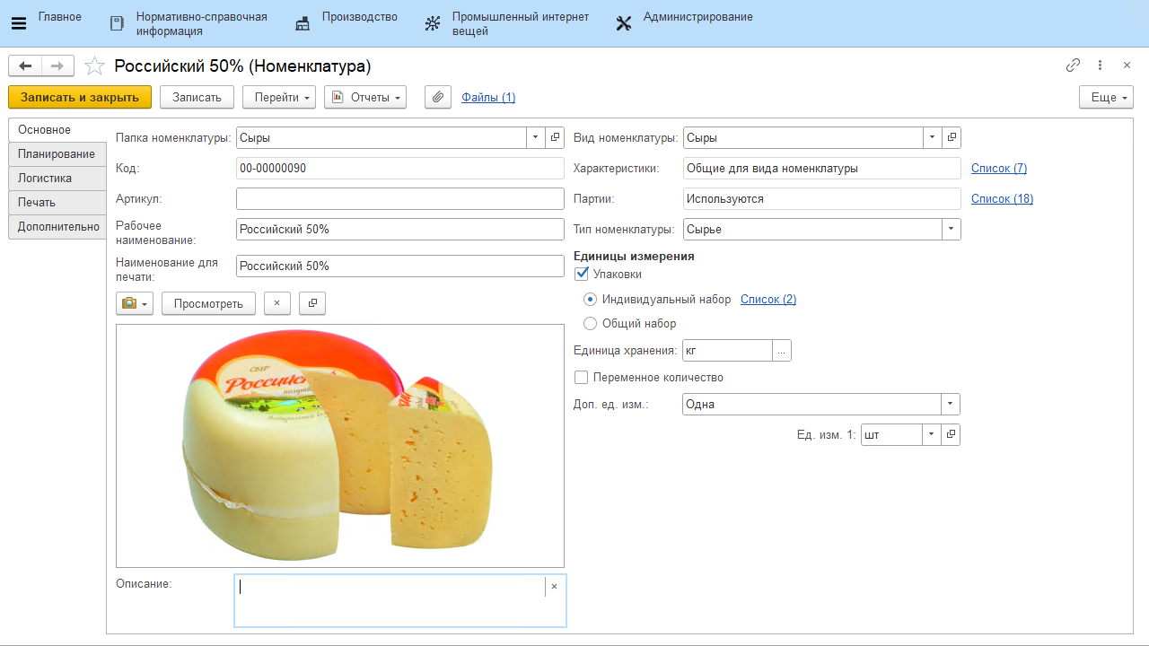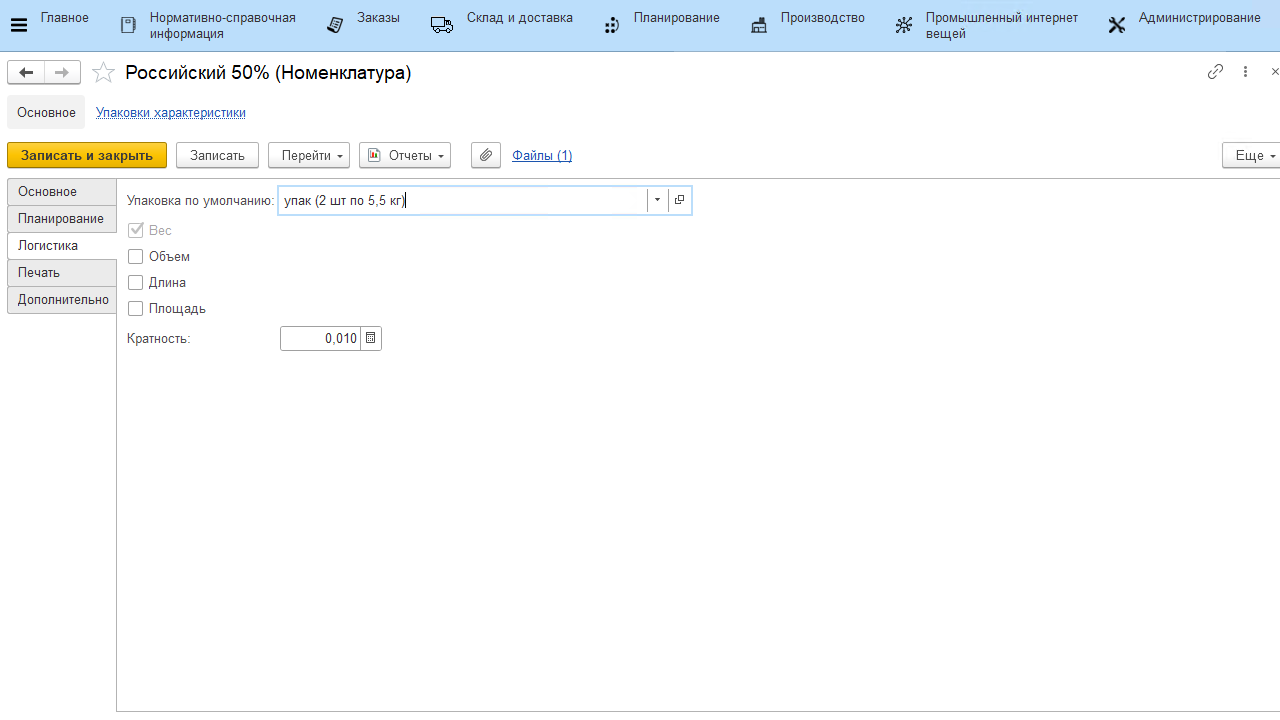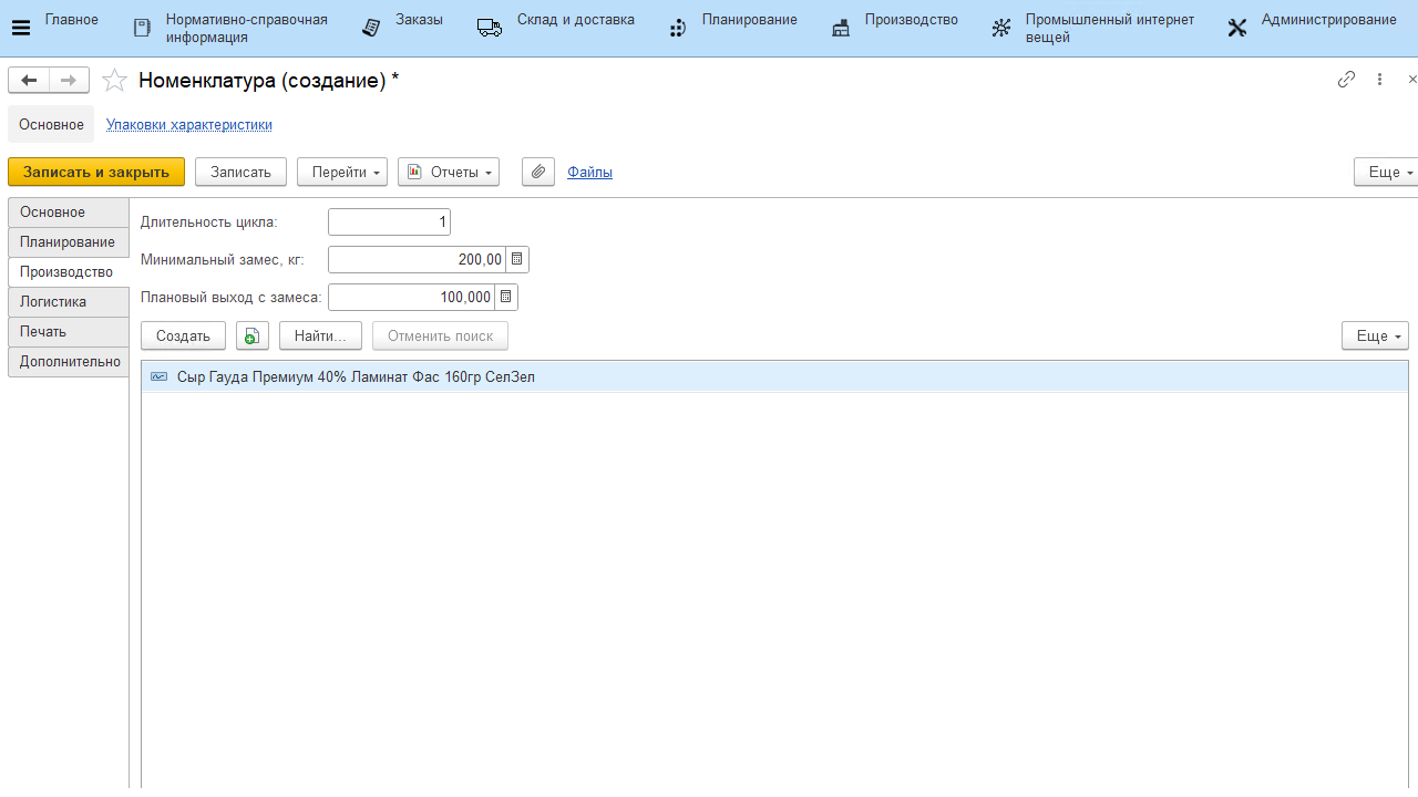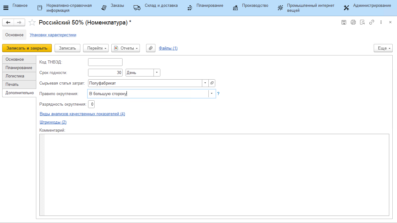 - Тип номенклатуры: готовая продукция, базовый продукт, упаковка, сырье, тара, многооборотная тара