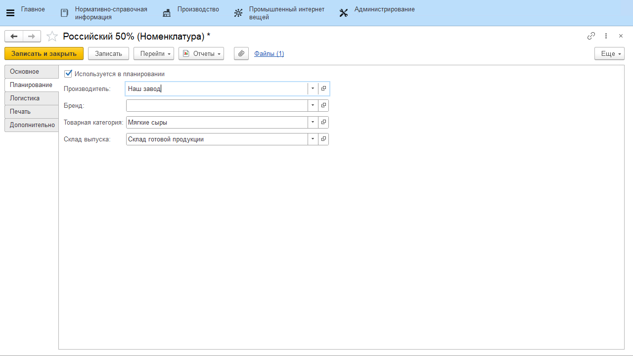 Для всех типов продукции, кроме "Упаковка" и "Сырье": - Использование в планировании - этот признак устанавливается для той номенклатуры, которая должна попасть в планирование по SKU - Производитель - Бренд - Товарная категория - Склад выпуска