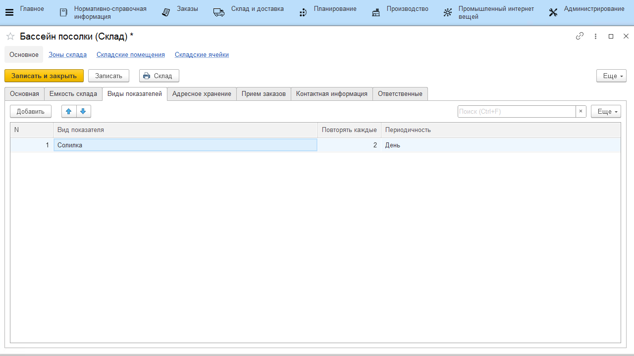 Задается набор видов показателей склада и периодичность, с которой будут создаваться заявки на учет этих показателей в системе.