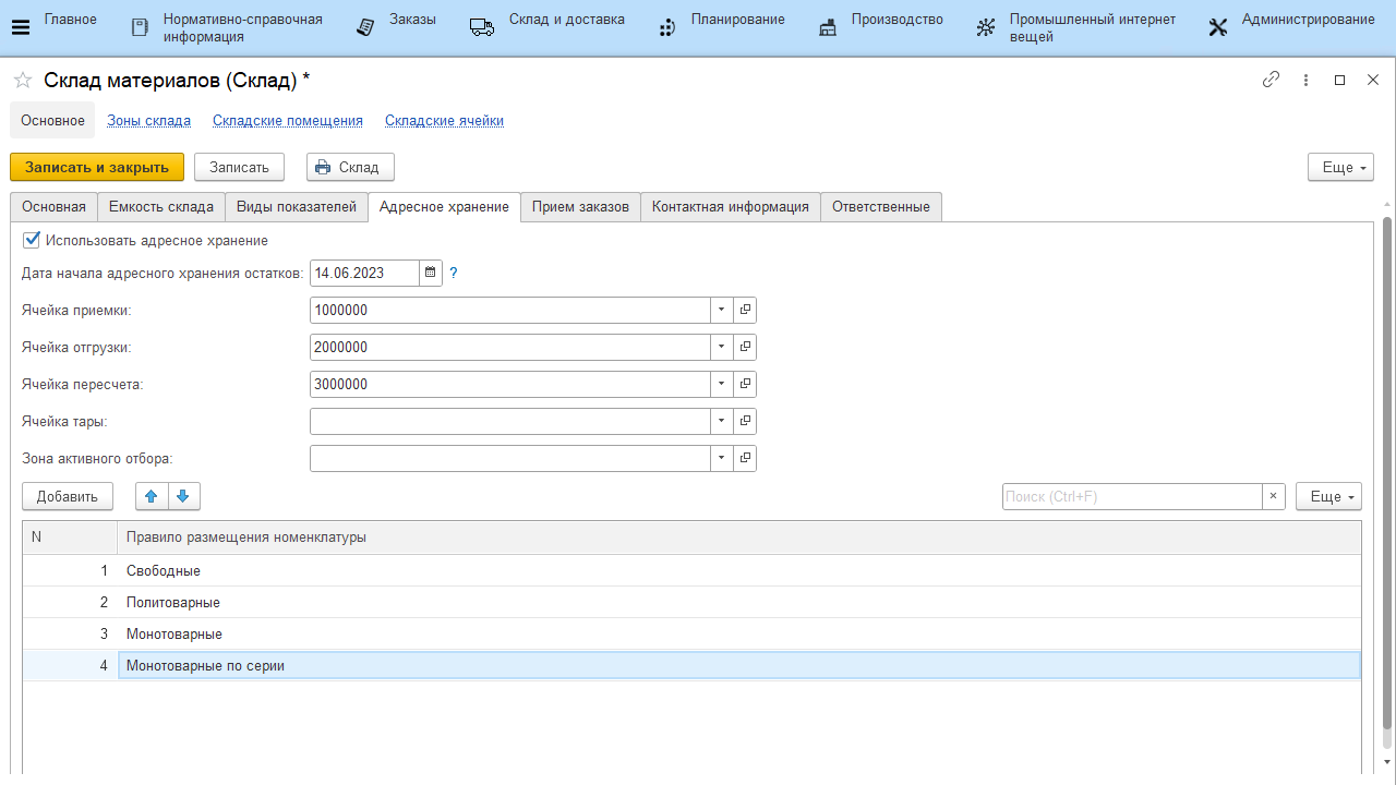 Ячейки можно создать из карточки склада или указать ранее созданные ячейки (см. Генерация топологии склада).
