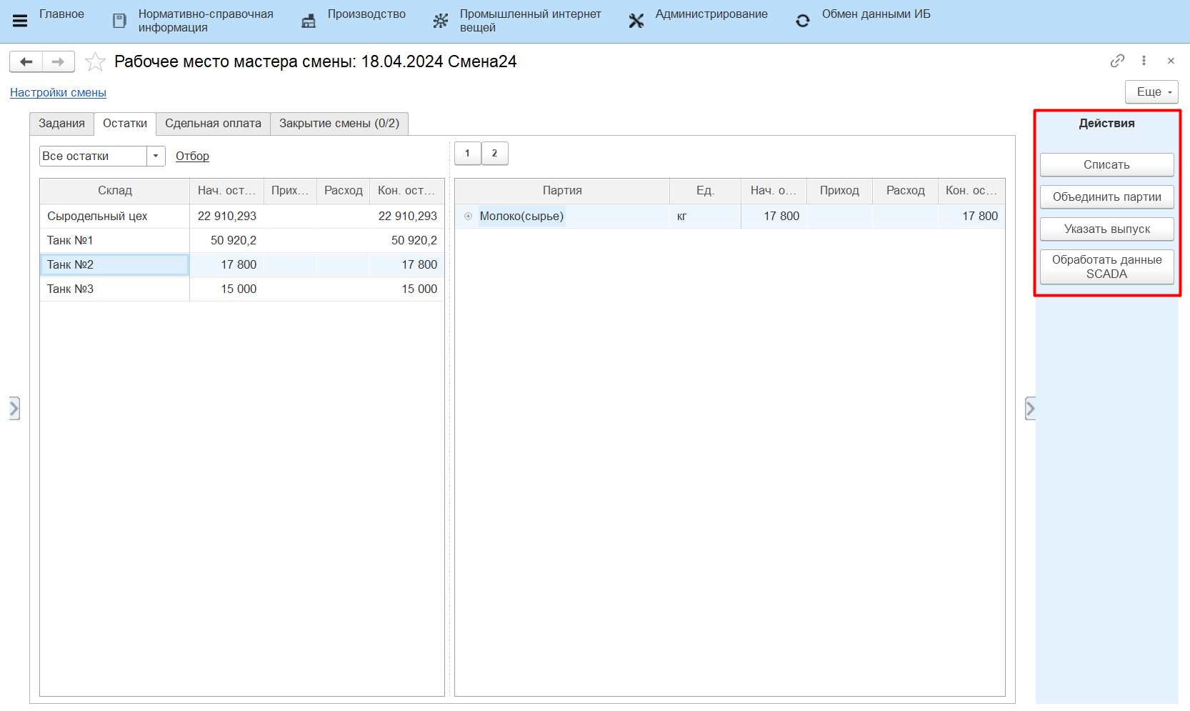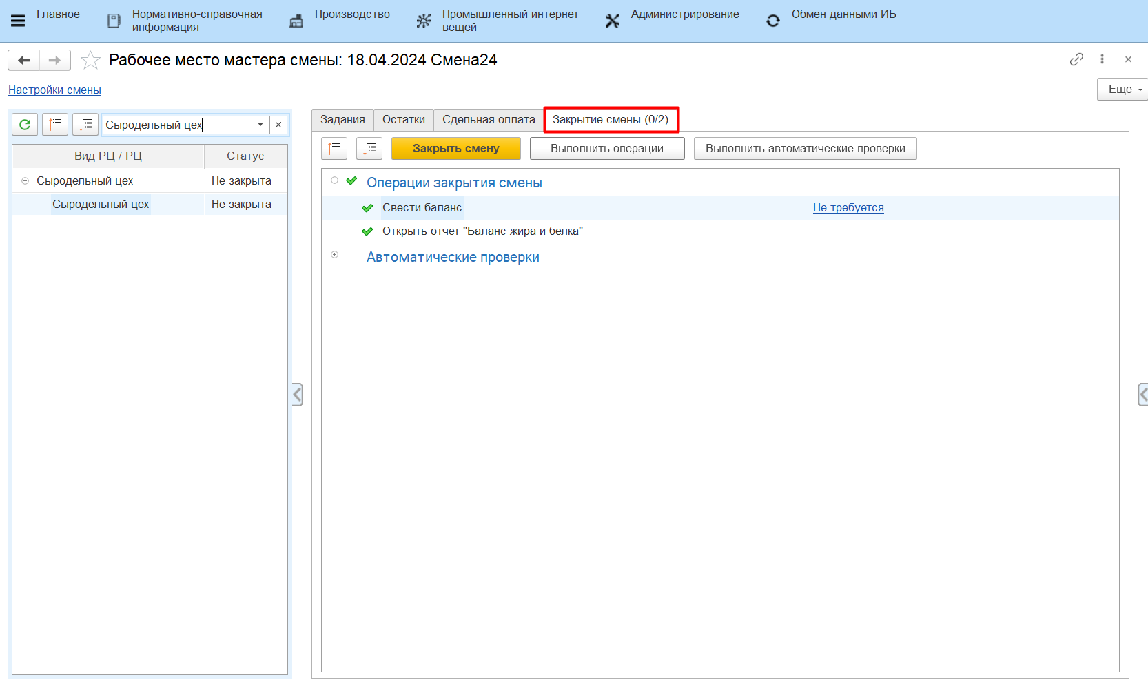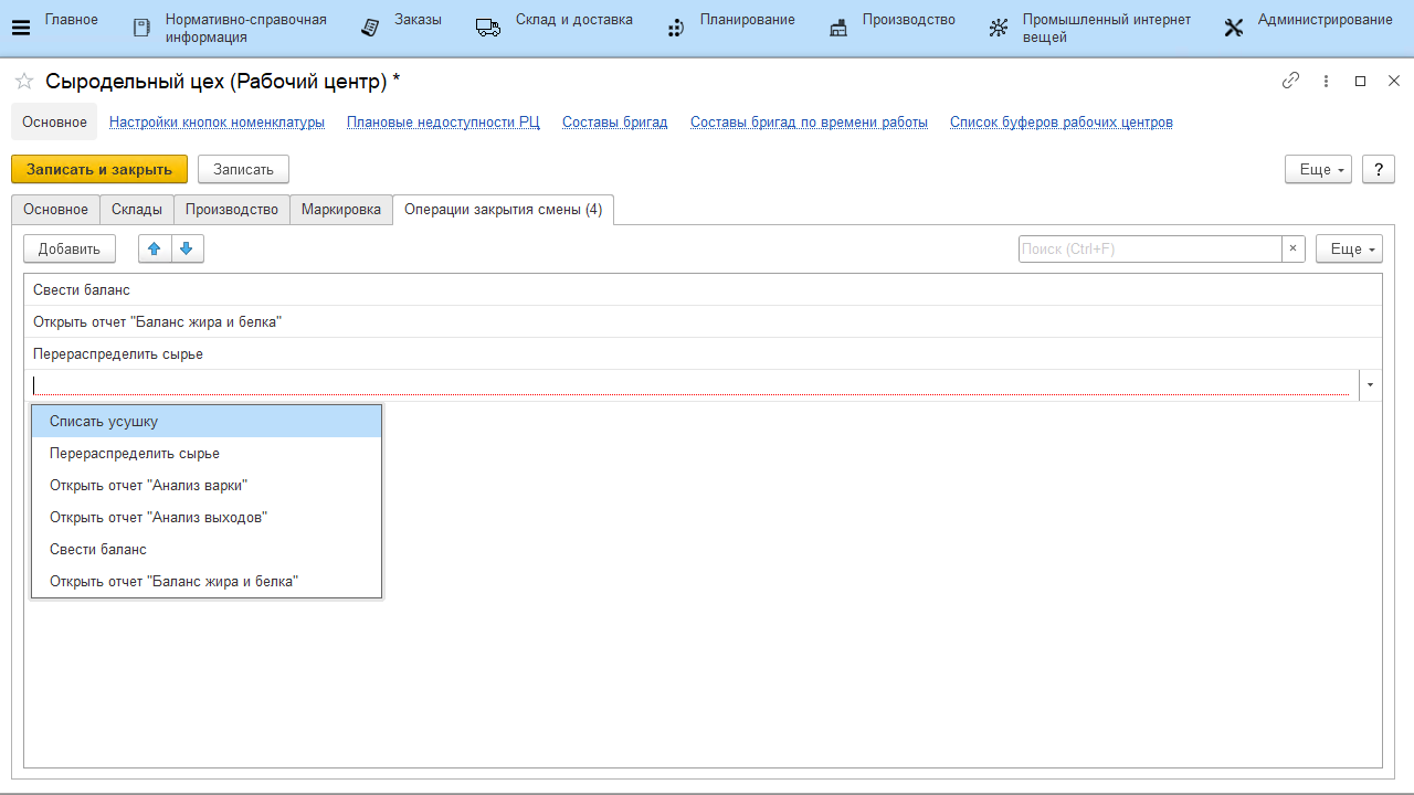 - Свести баланс - при закрытии смены будет сведен баланс по жиру и белку (используется на переделах, где берутся анализы жира и белка сырья и продукции);