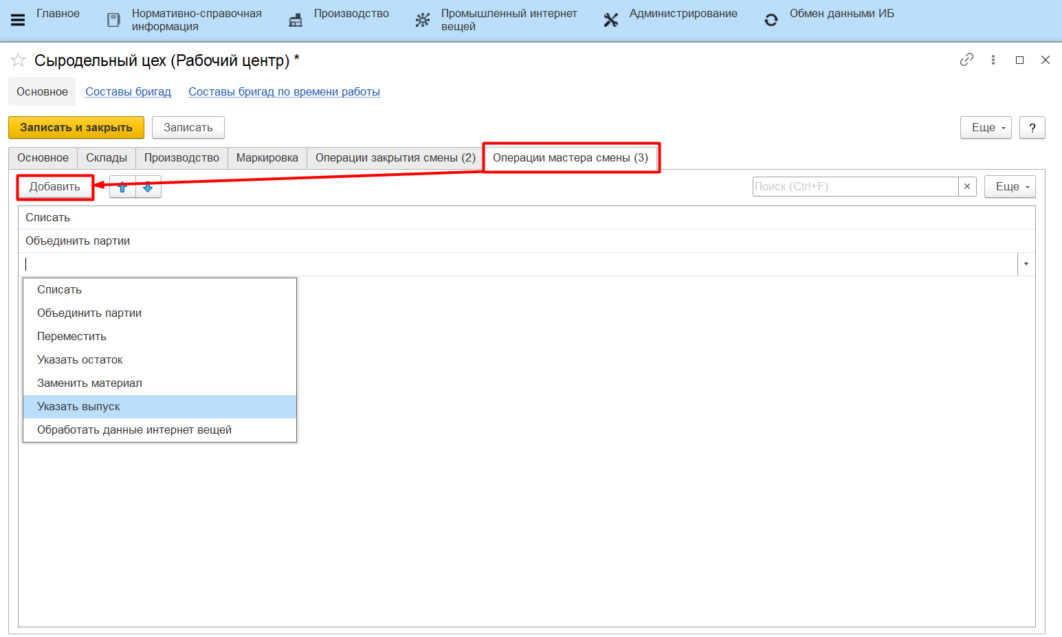 Вкладка "Операции мастера смены"
