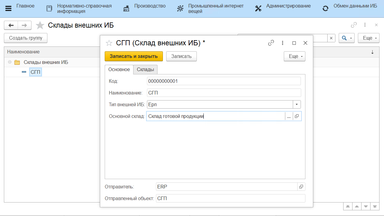Справочник "Склады" загружается в справочник "Склады внешних ИБ" базы MES4FOOD.
