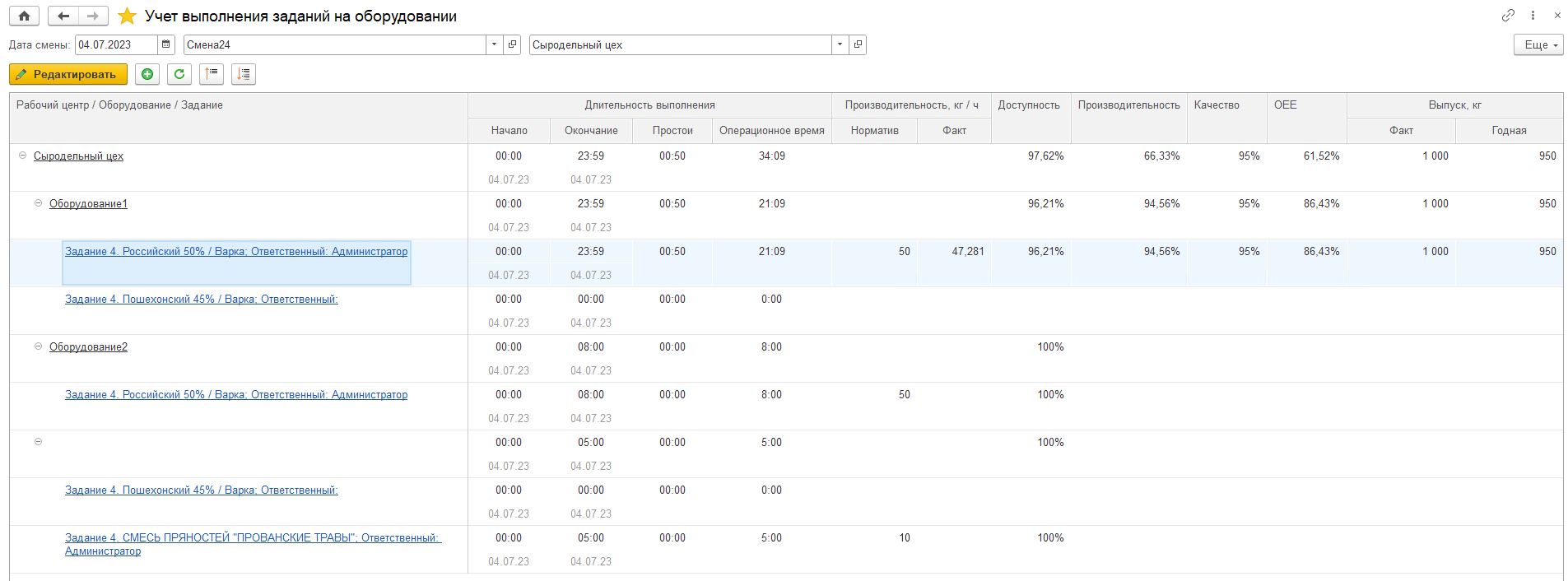 Для отслеживания показателей общей эффективности оборудования в системе предусмотрен АРМ Учет выполнения заданий на оборудовании.