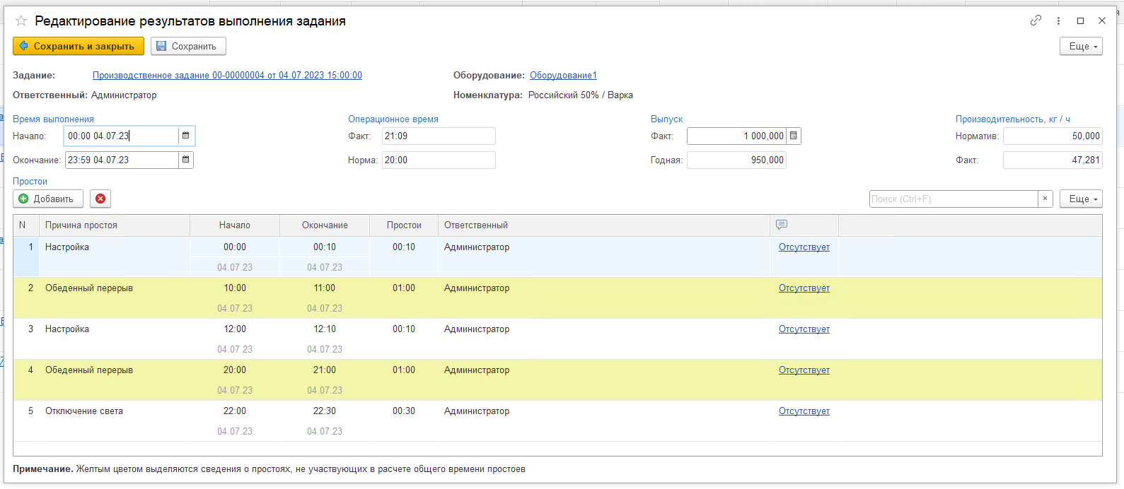 - Простои, сумма учитываемых простоев внутри задания.