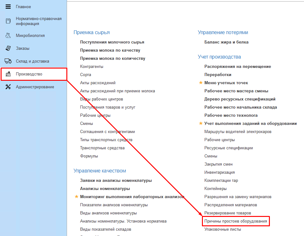 Справочник находится в подсистеме Производство - Учет производства - Причины простоев оборудования.
