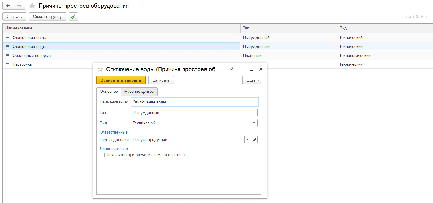 На вкладке Рабочие центры при снятии признака Общая причина простоя можно указать конкретные рабочие центры, для которых будет доступен выбор данного простоя.