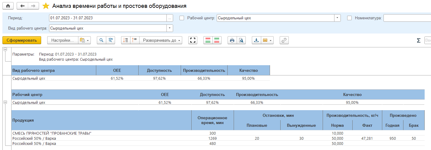 В отчете выводятся результаты выполнения заданий по виду рабочего центра и рабочему центру по следующим формулам: