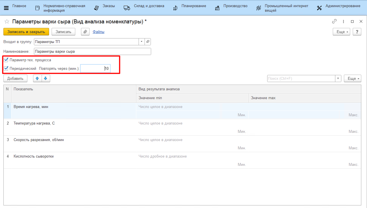 В случае, если какие-то показатели учитываются несколько раз за время процесса (например, замеряется температура), установить галочку 'Периодический'" и указать периодичность анализа в минутах