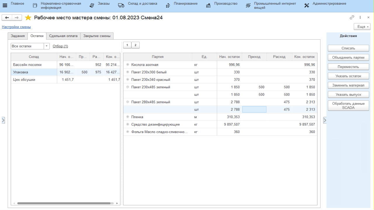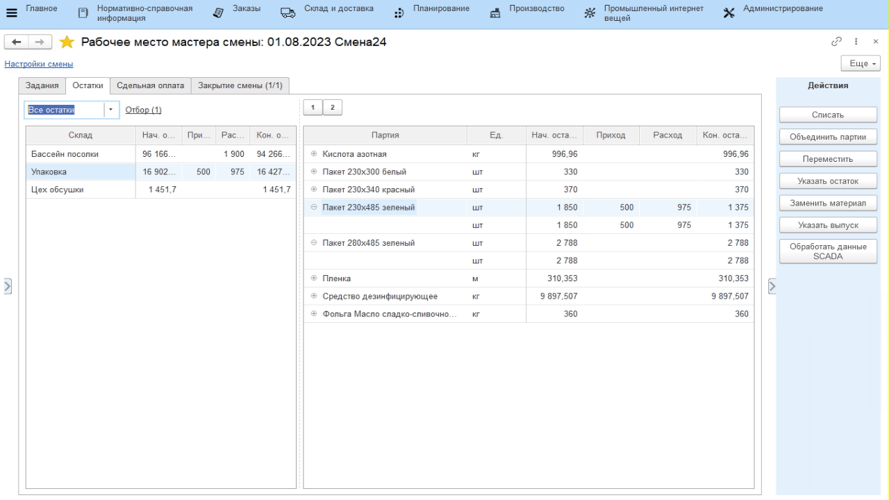 - Если в процессе упаковки сыра были выявлены бракованные пакеты, то здесь же можно учесть и их. Для этого выбрать пакет для учета его брака и нажать "Списать";
