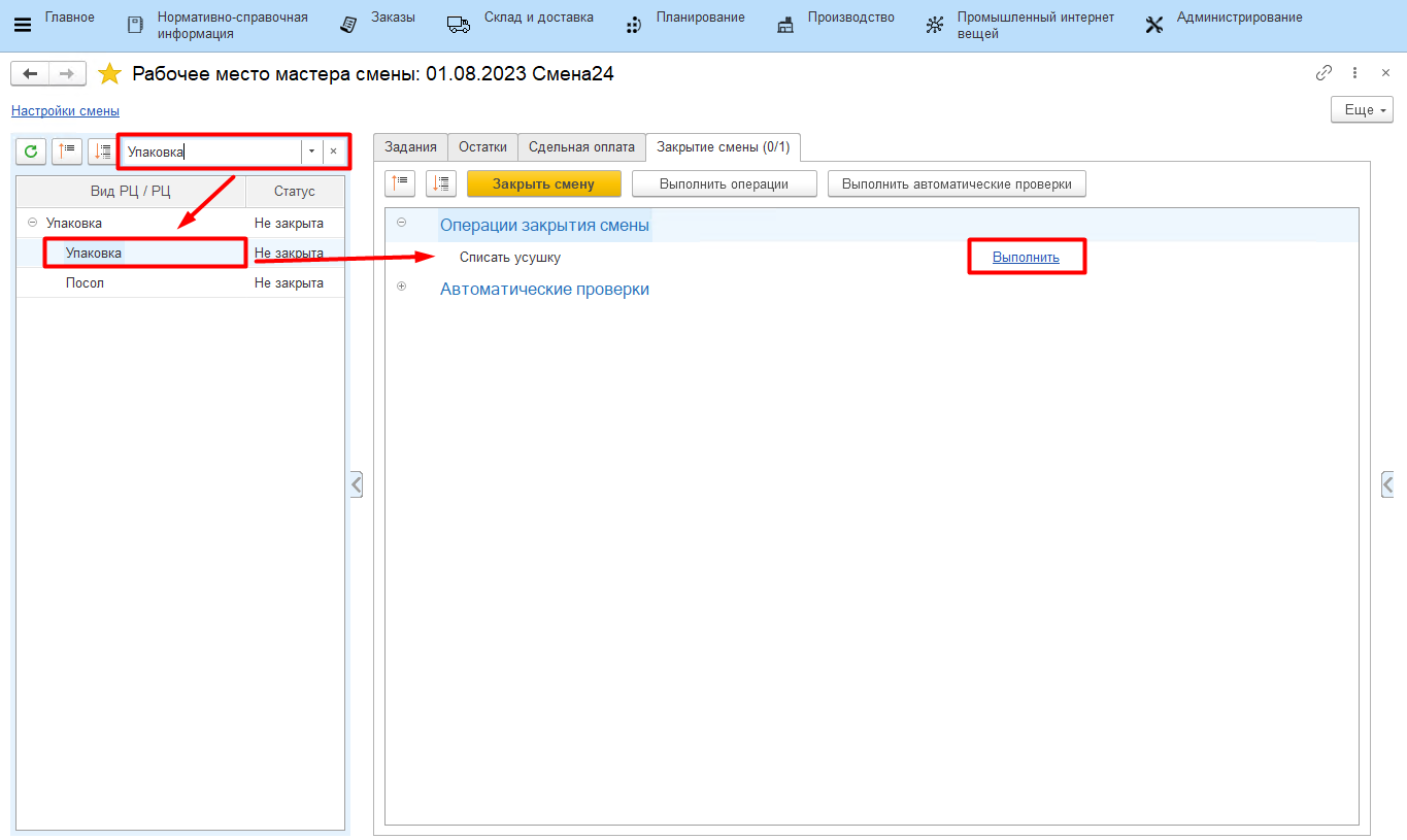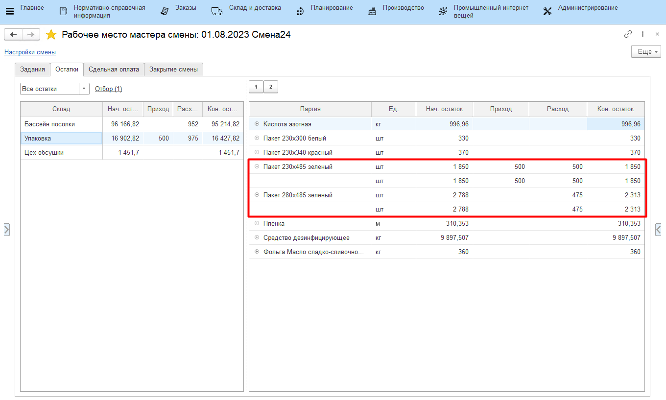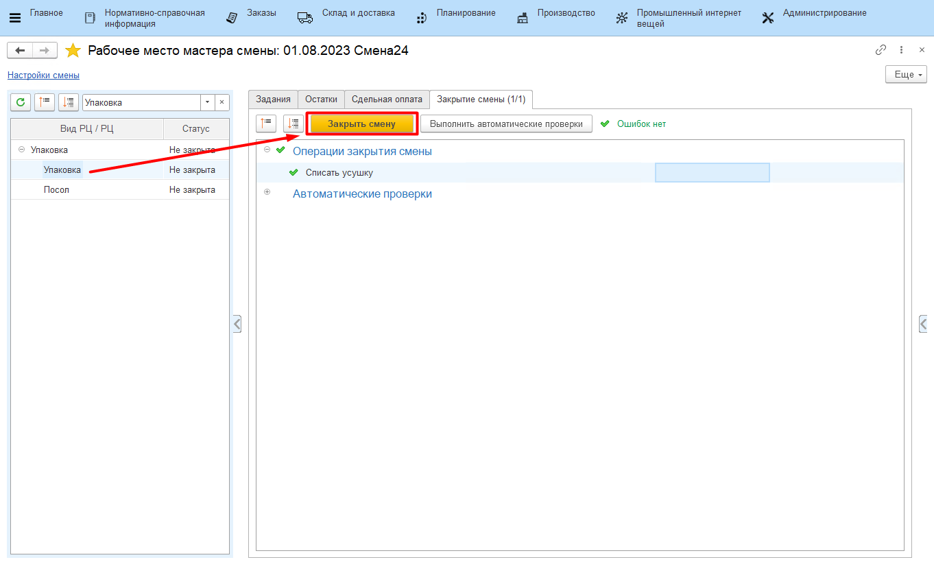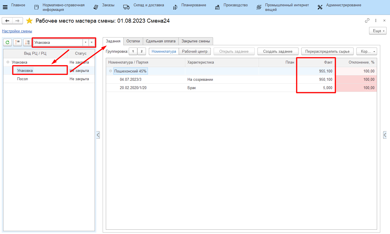 - Указать смену для контроля и вид рабочего центра, на котором сыр извлекается из солилки и упаковывается в пакеты;