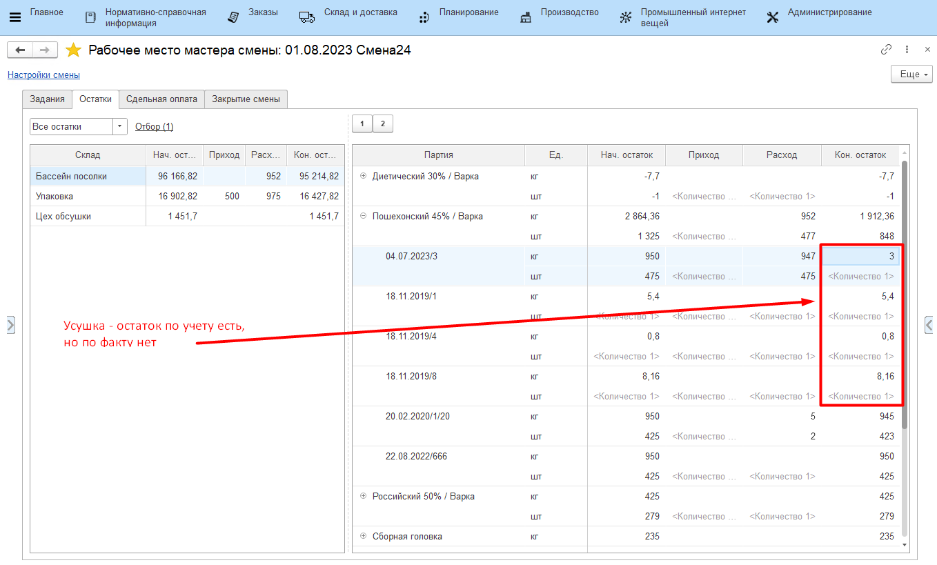 На вкладке "Остатки" можно видеть условные остатки кг сыра, получившиеся в результате разницы между входным количеством сыра в солилку и извлеченным. Они получаются из-за процесса усушки. Эти остатки необходимо "списать" при итоговом закрытии смены (см. далее).