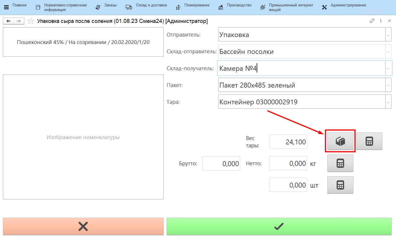 - Если сыр взвешивается на таре, например, на паллете или в ящиках с фиксированным весом, то, нажав "Калькулятор тары", можно указать их количество: