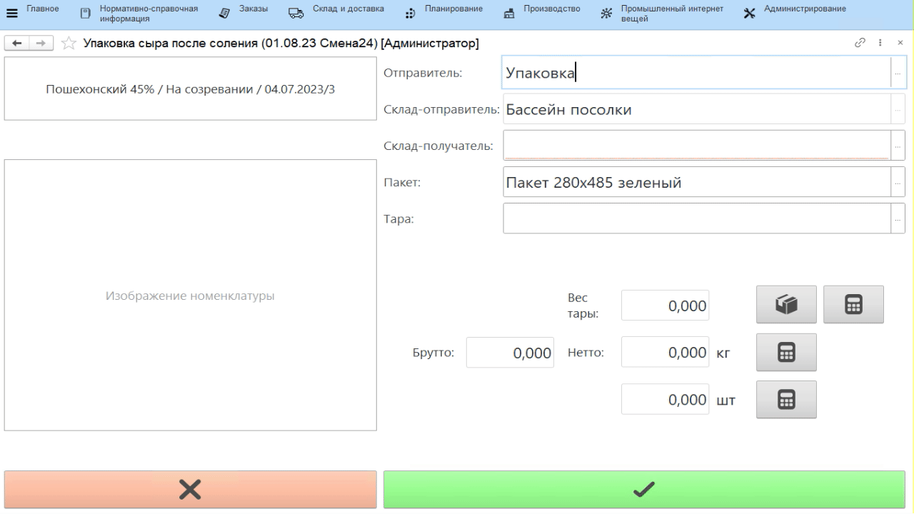 - В открывшейся форме указать, на какой склад передается варка сыра и в какой пакет упаковывается;