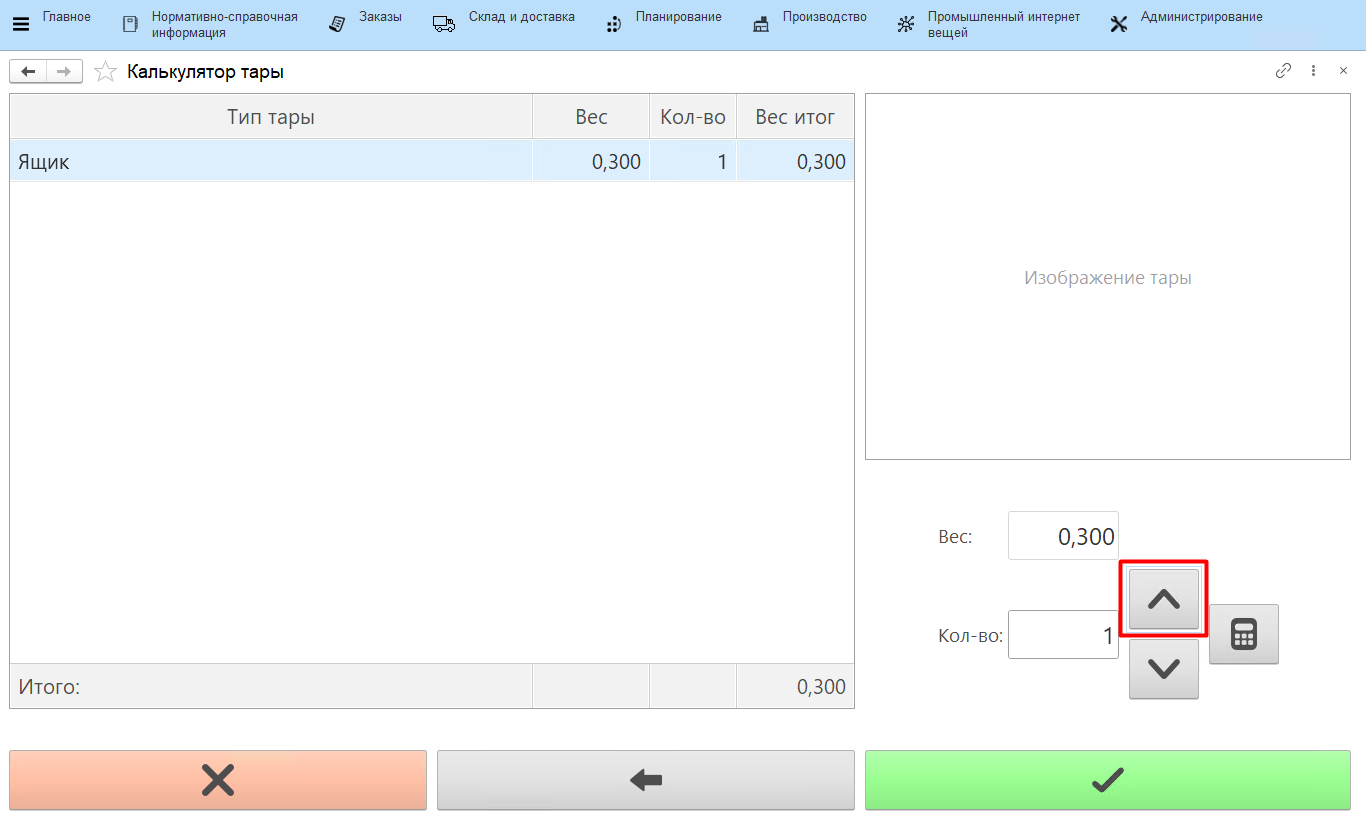 - В открывшейся форме указать количество каждого используемого типа тары. Для этого нажать на соответствующую строку и, используя стрелки "вверх" и "вниз", обозначить число;