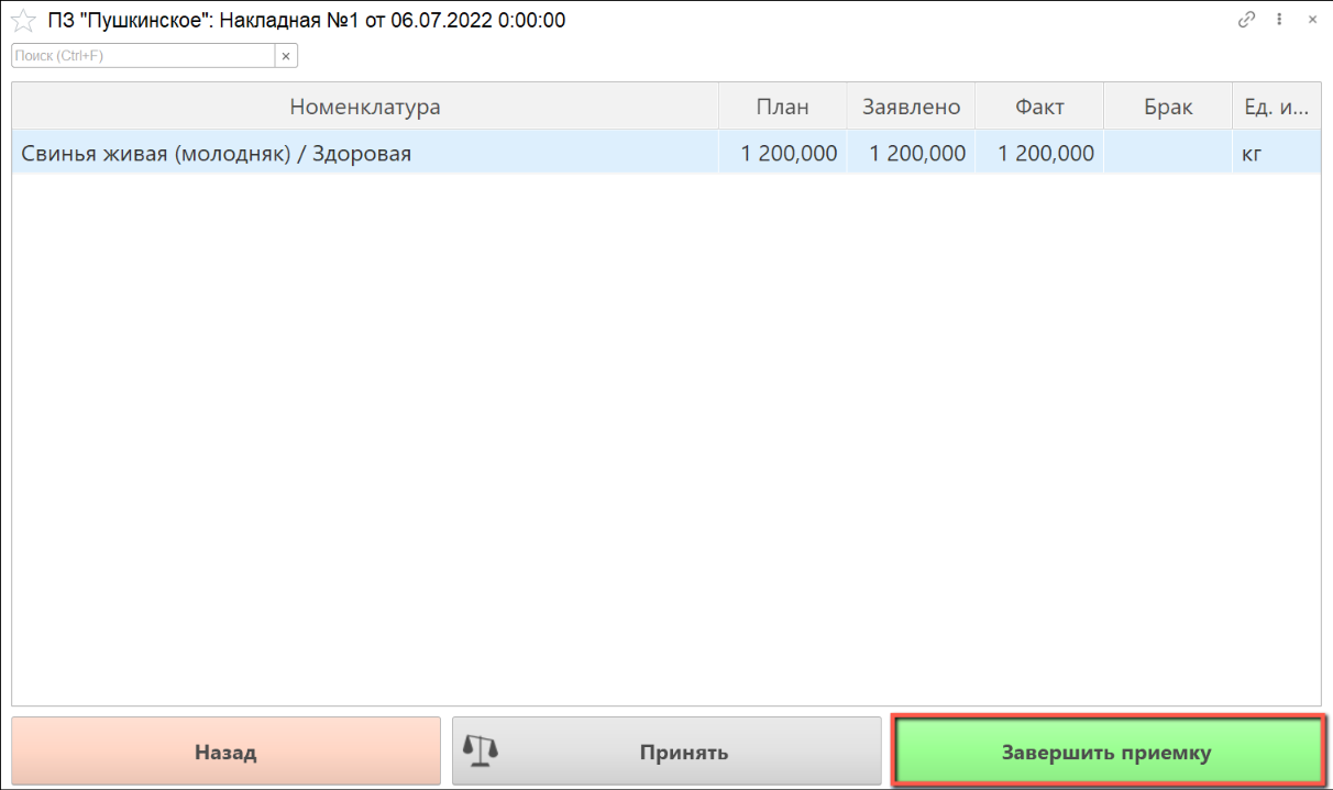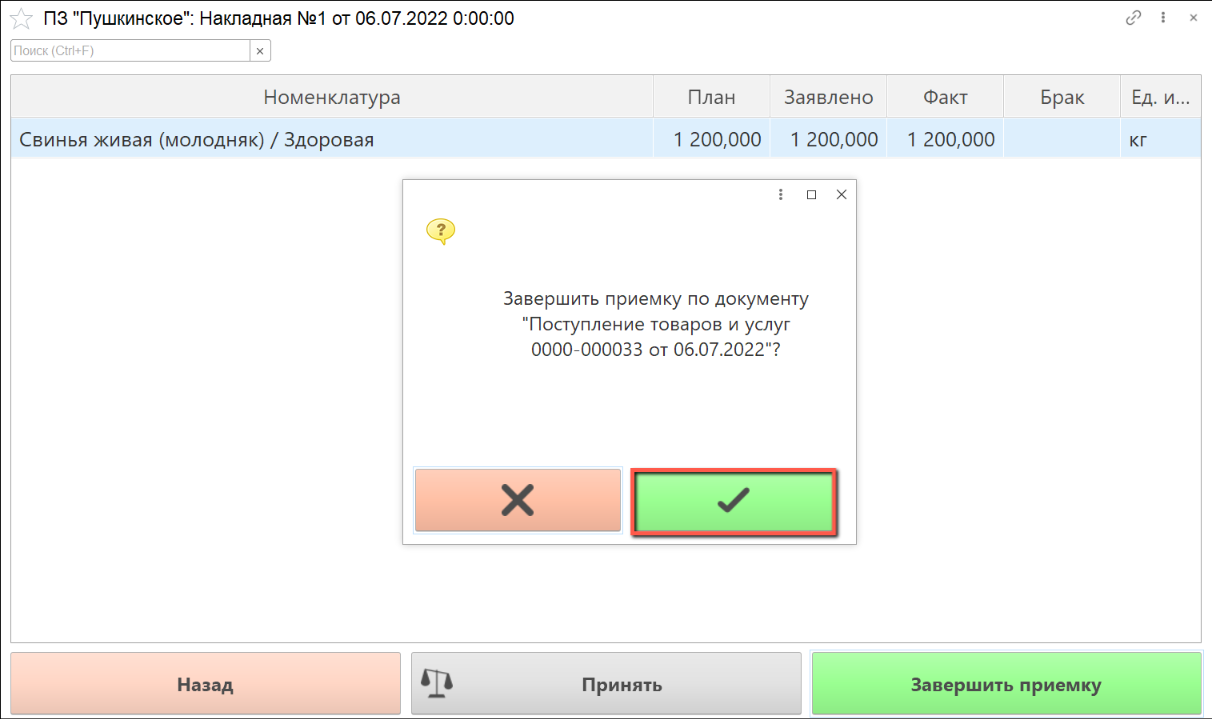 - Если приемка номенклатуры по данному документу завершена, нажимаем кнопку "Завершить приемку":