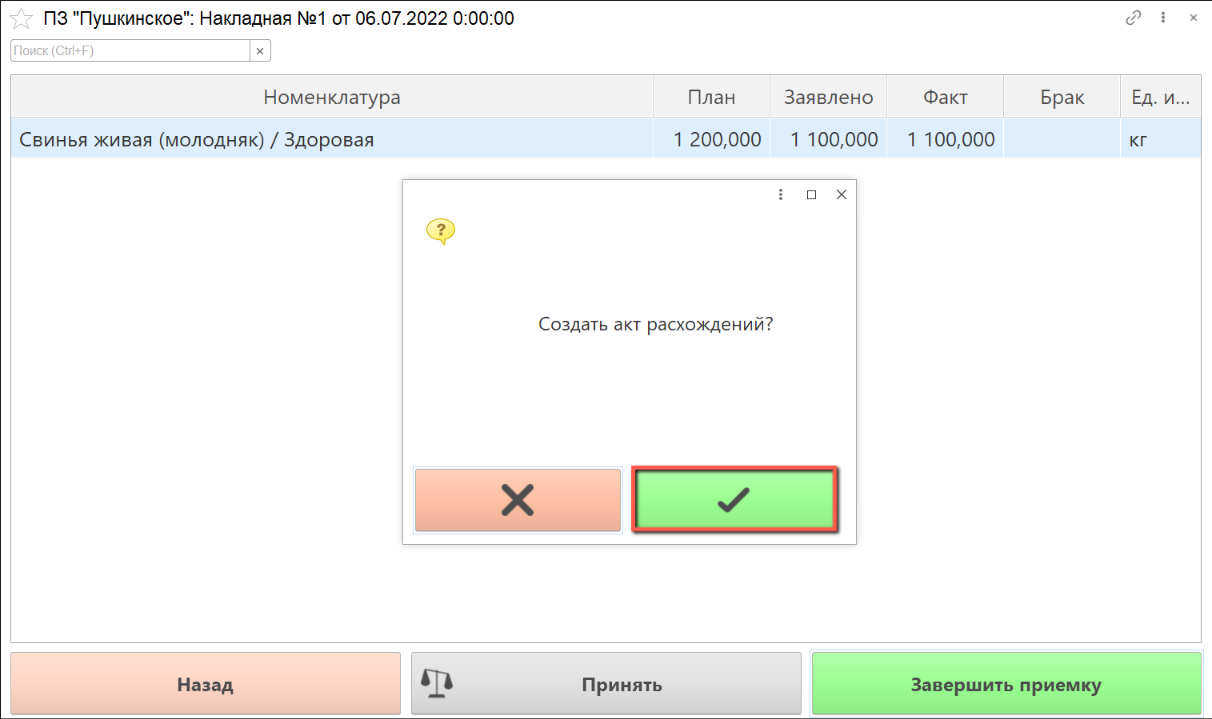 Если по документу выявлены расхождения фактического количества сырья с запланированным, система предложит создать акт расхождений. Если по мнению пользователя, отклонение от нормы в пределах допустимого, он может отказаться от создания акта.