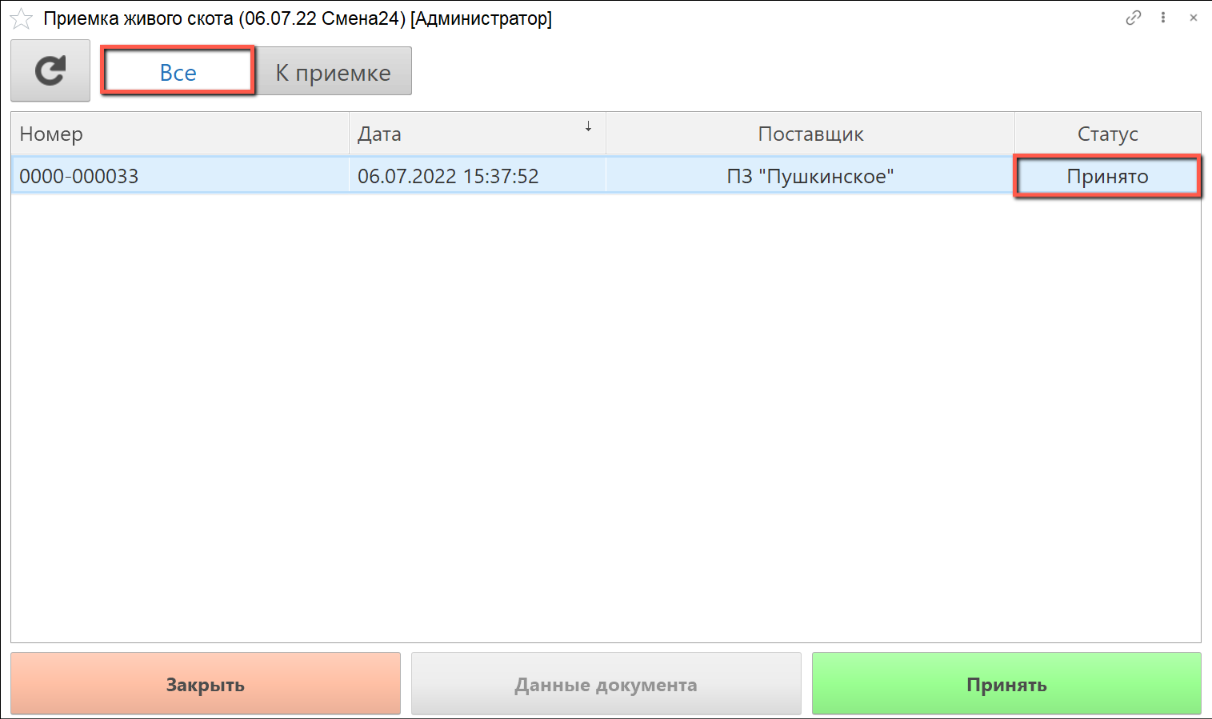 Чтобы увидеть список документов "Поступление товаров", которые были обработаны за текущую смену, в основном окне АРМ переключаем отображение документов в значение "Все". Обработанные документы отобразятся в списке со статусом "Принято":