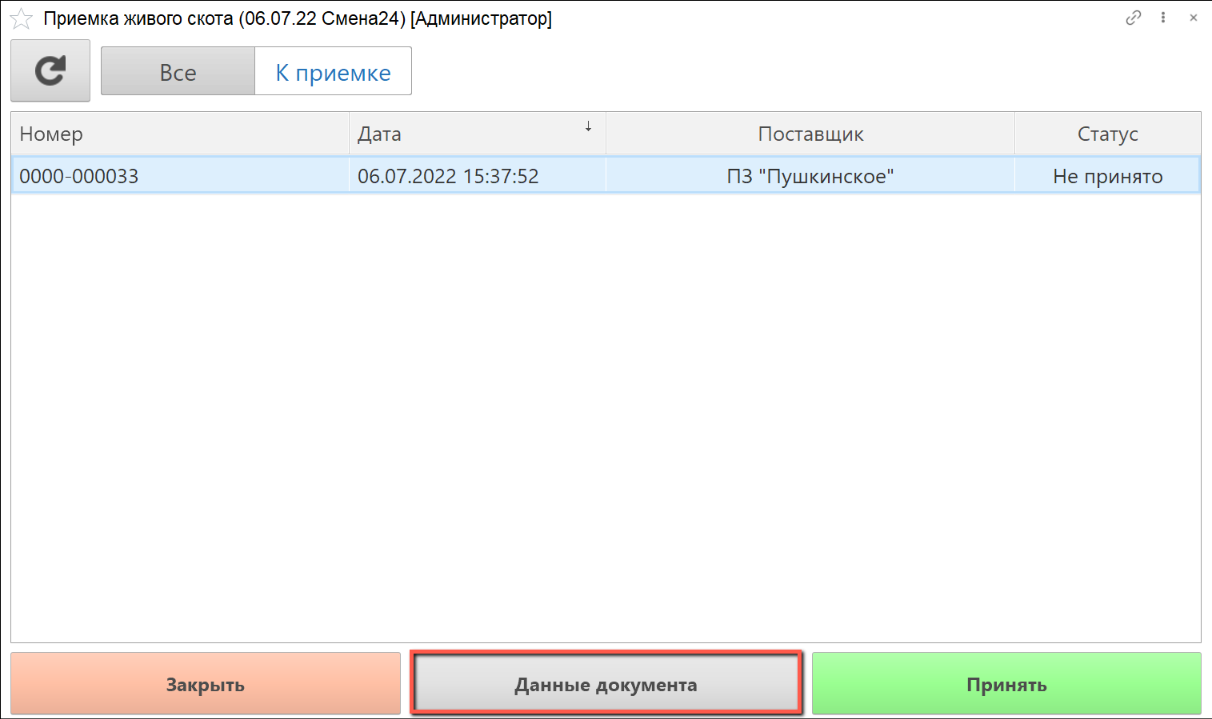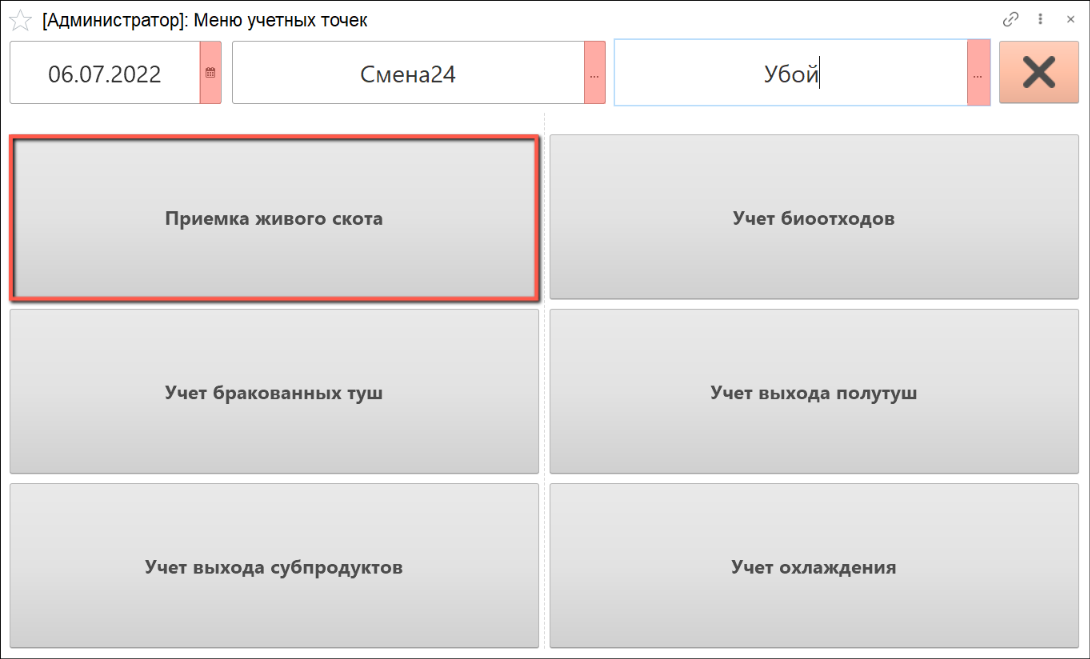 - Указываем дату планового поступления, смену и рабочий участок, на котором производится приемка. Нажимаем кнопку "Приемка живого скота":