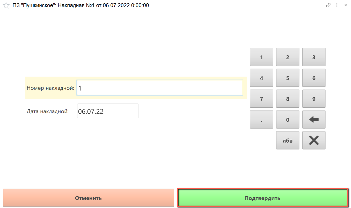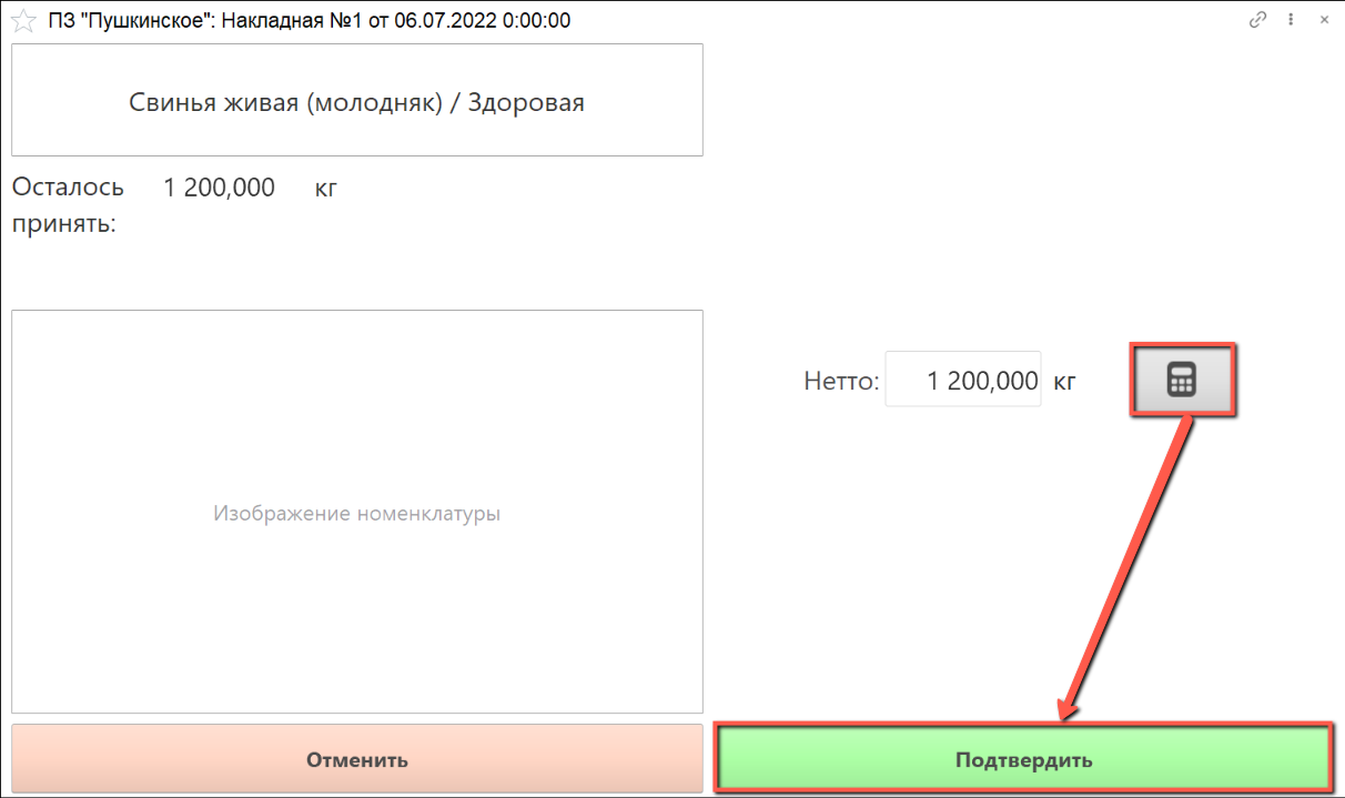 - Указываем фактический вес принимаемой партии и нажимаем на кнопку "Подтвердить"