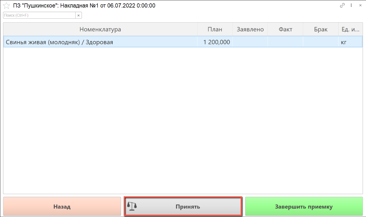 Если необходимо добавить партию или отвес какой-либо номенклатуры, нажимаем кнопку "Принять".