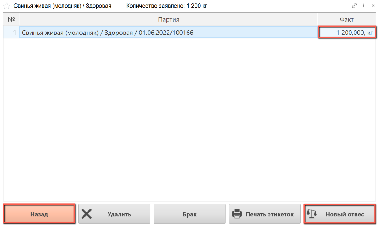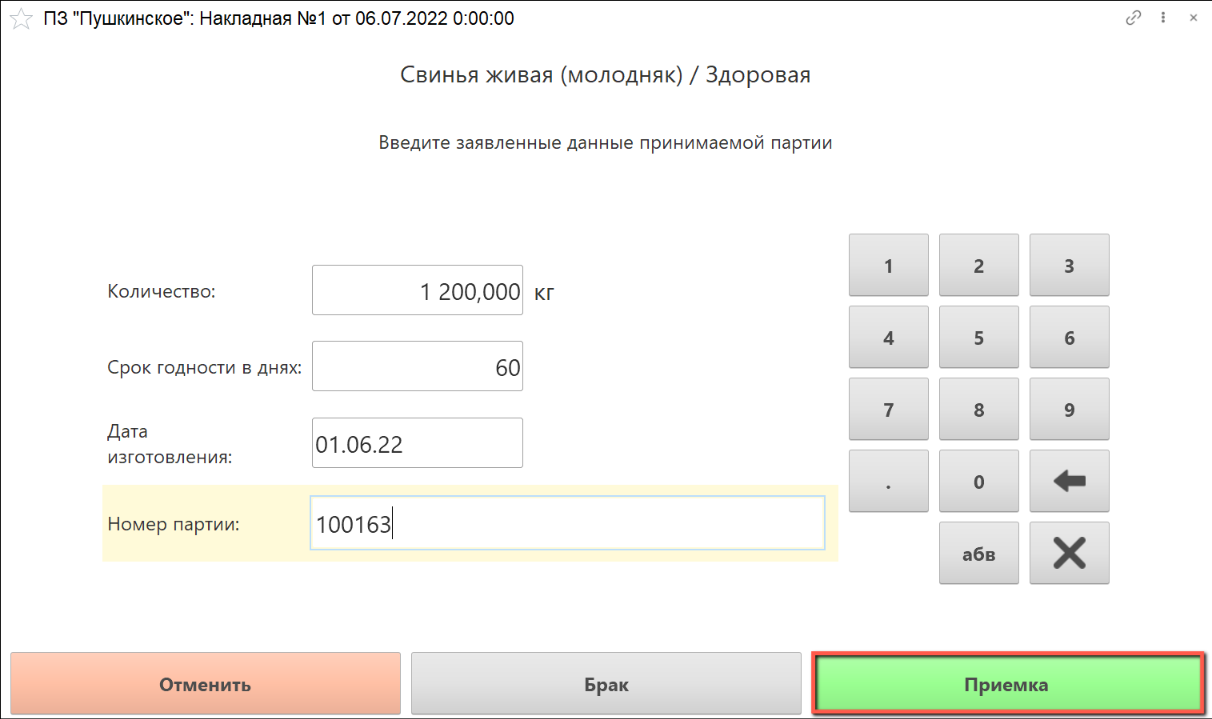 Если в партии обнаружен брак, необходимо взвесить его, нажав соответствующую кнопку. Подробнее о приемке брака читайте в разделе "Отбраковка"