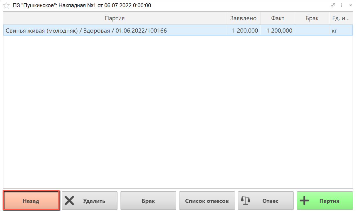 Для завершения операций по учету приемки данной партии сырья нажимаем кнопку "Назад":