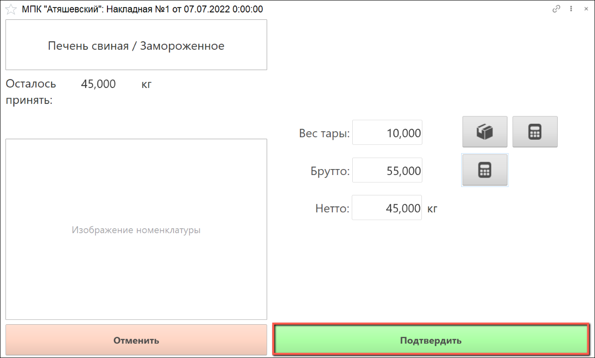 Открывается окно для учета данных взвешивания сырья. В левом верхнем углу отображается информация о номенклатуре и количестве, которое осталось принять.