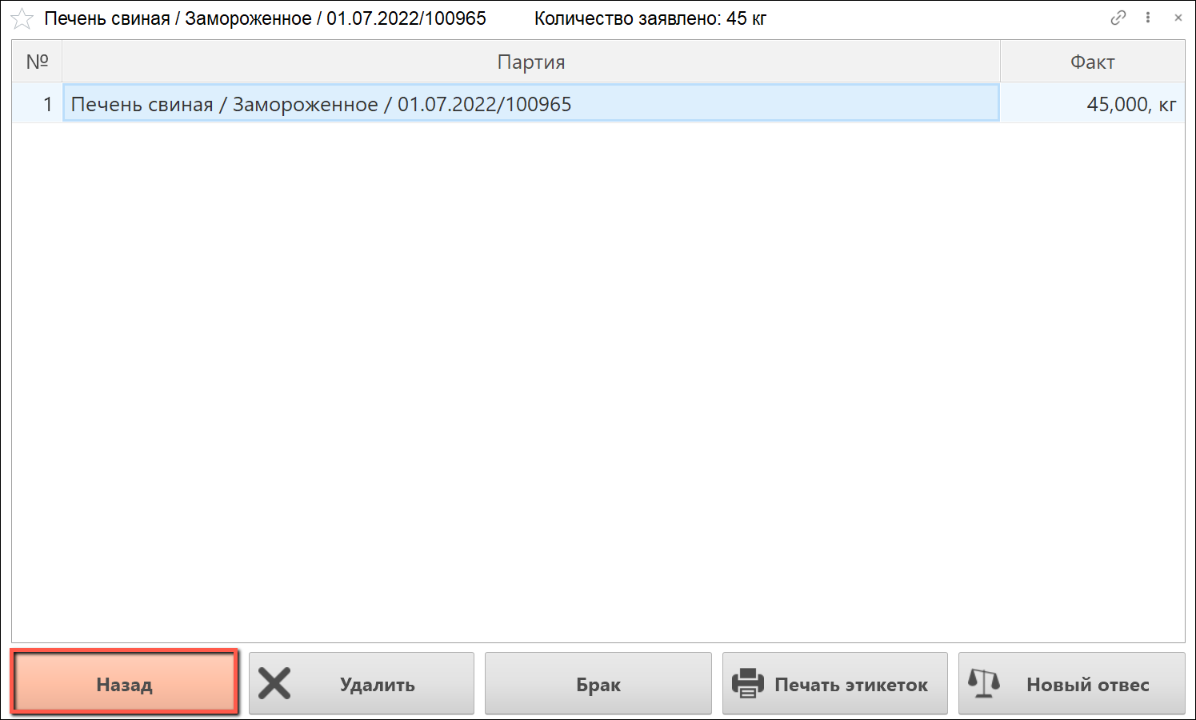 Если в партии обнаружен брак, необходимо взвесить его, нажав соответствующую кнопку. Подробнее о приемке брака читайте в разделе "Отбраковка"