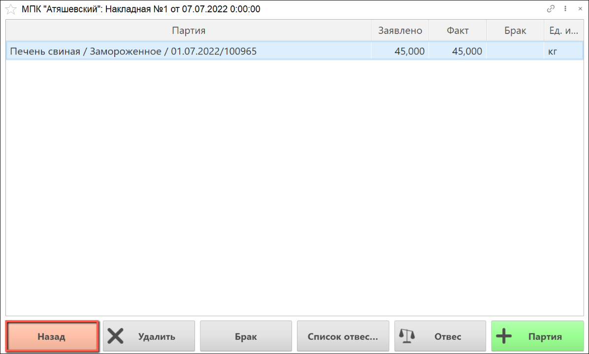 Для завершения операций по учету приемки данной партии сырья нажимаем кнопку "Назад":