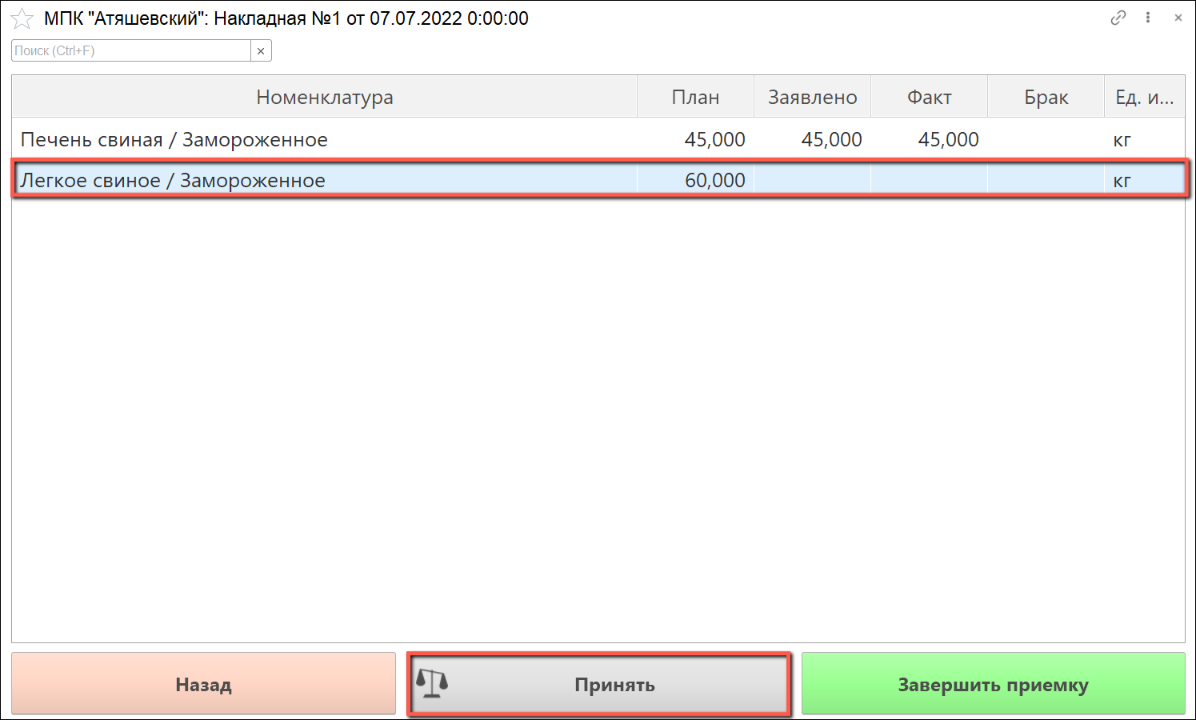 - Если необходимо добавить партию или отвес какой-либо номенклатуры, нажимаем кнопку "Принять". Далее повторяем все действия аналогично первой номенклатуре: