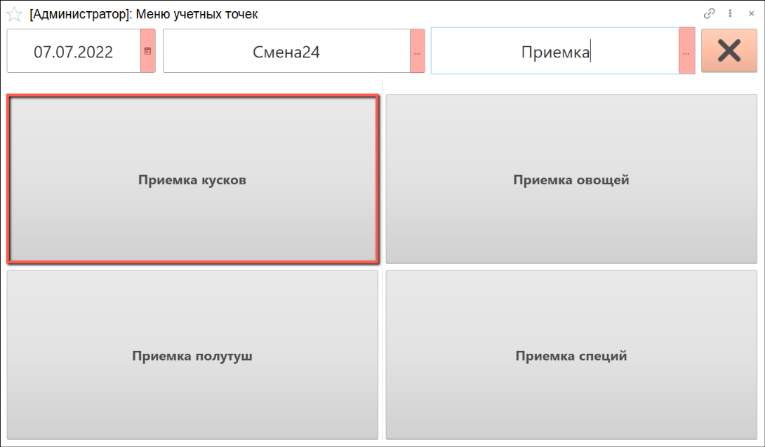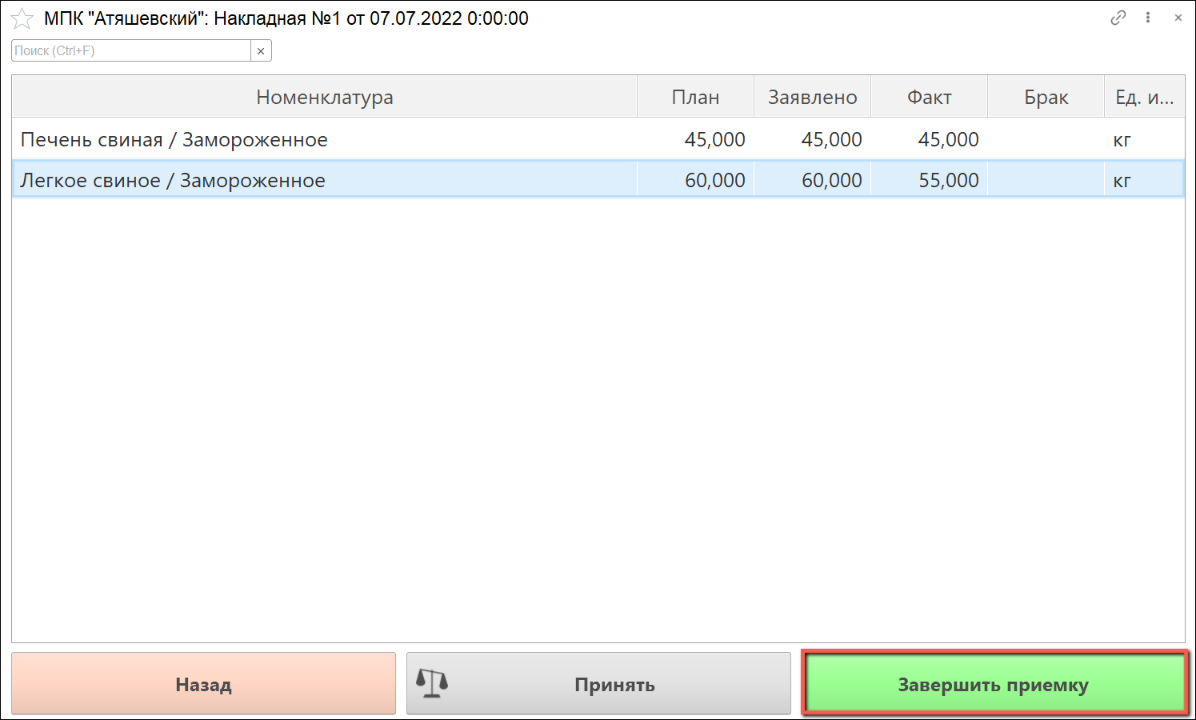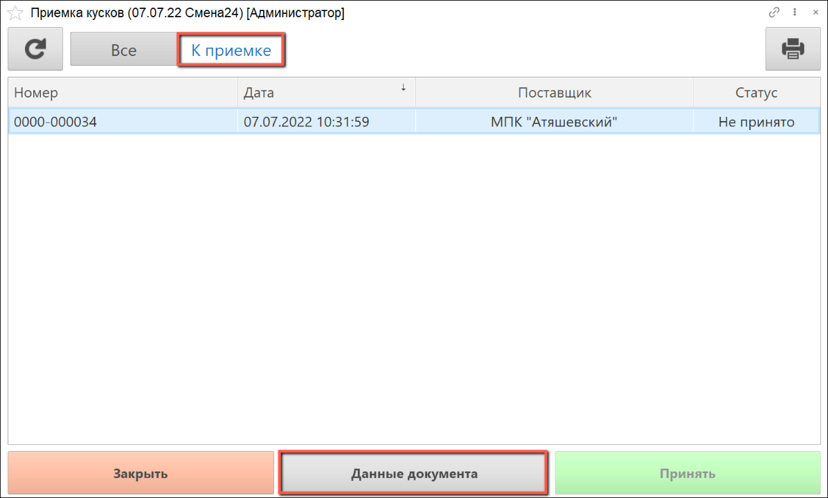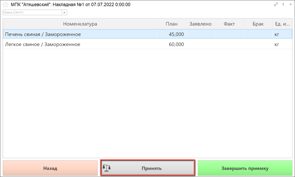 Нажимаем кнопку "Приемка" для приемки сырья:
