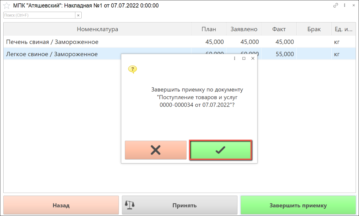 - Если приемка номенклатуры по данному документу завершена, нажимаем кнопку "Завершить приемку":