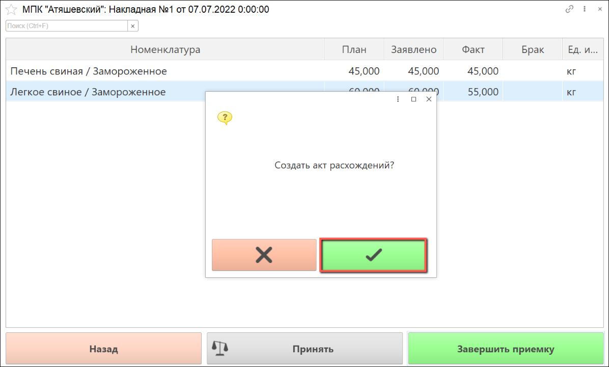 Если по документу выявлены расхождения фактического количества сырья с запланированным, система предложит создать акт расхождений. Если по мнению пользователя, отклонение от нормы в пределах допустимого, он может отказаться от создания акта.