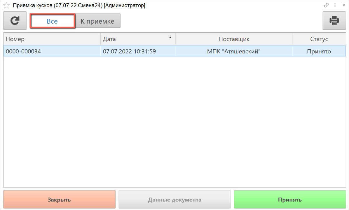 Чтобы увидеть список документов "Поступление товаров", которые были обработаны за текущую смену, в основном окне АРМ переключаем отображение документов в значение "Все". Обработанные документы отобразятся в списке со статусом "Принято":