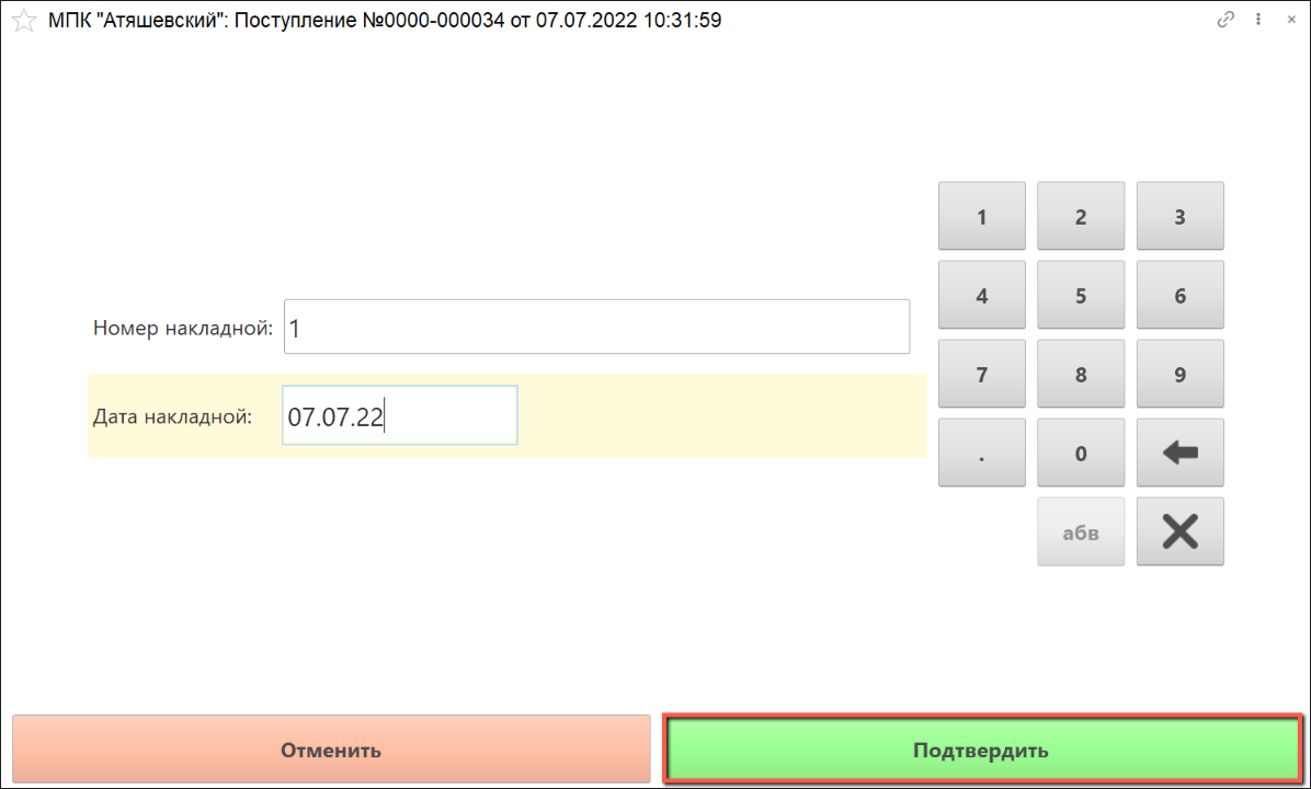 Открывается окно для заполнения данных о принимаемой позиции по накладной поставщика.
