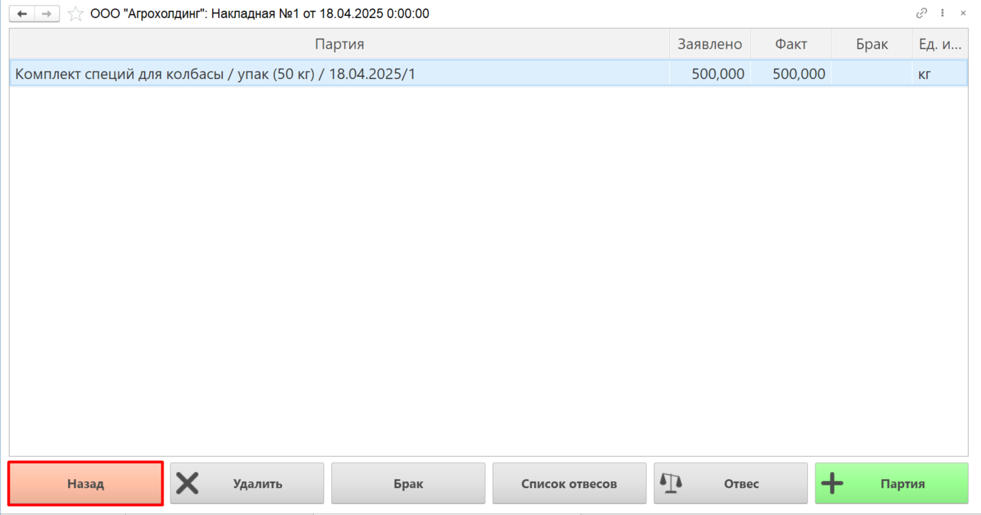 Для завершения операций по учету приемки данной партии сырья нажимаем кнопку "Назад":